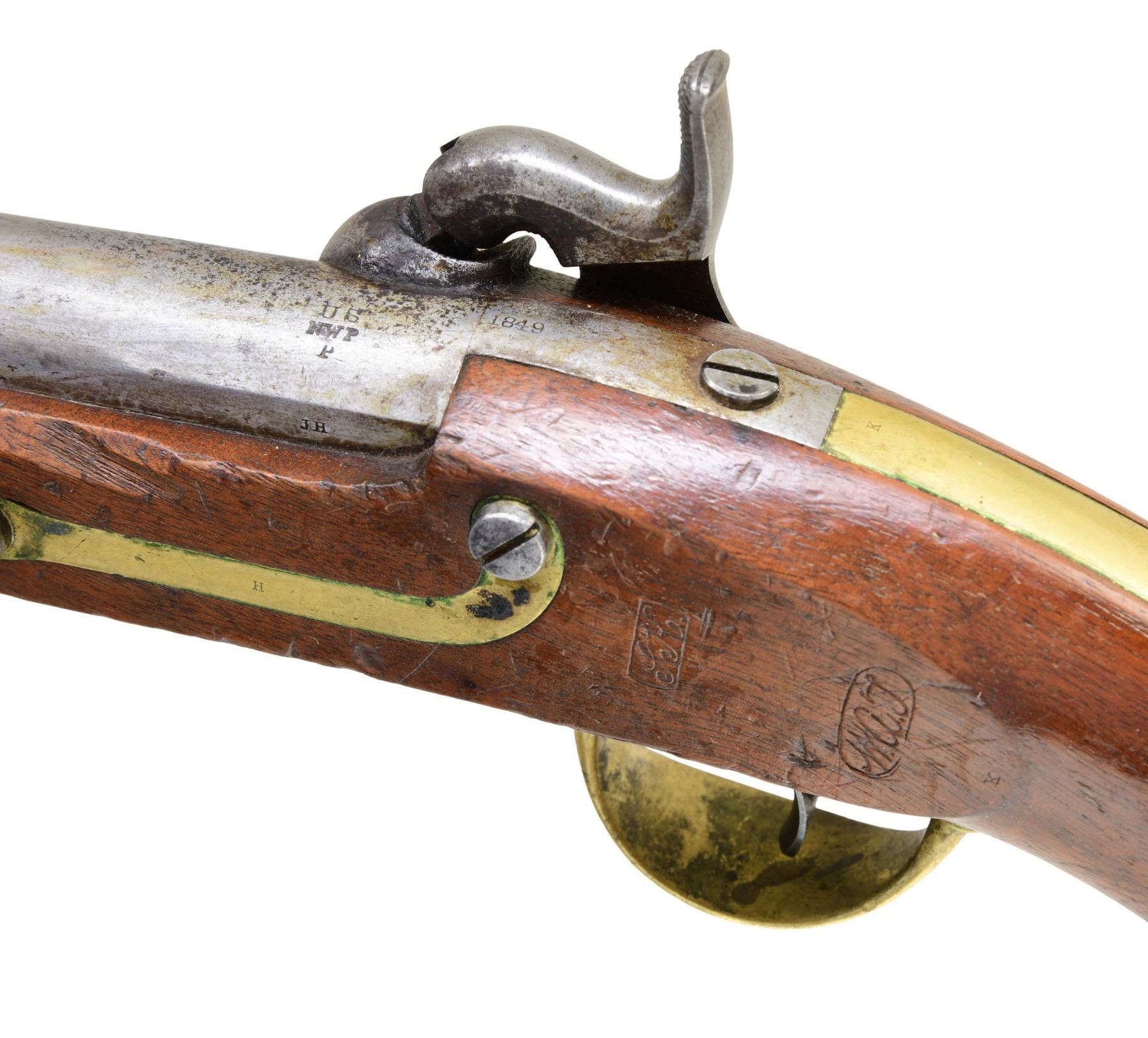 Cal. 54. NSN. Bbl. 8 1/2" round w/ smooth bore. Bbl. & lock are dated 1849. Breech end of bbl. has "NWP" & "JH" inspector's marks. Band fastened walnut stock w/ brass fittings. Left ear of stock has clear "LH" & "WAJ" cartouches. Button tipped iron swivel ramrod. Approx. 24,000 mfg. 1846-50. CONDITION: metal has faded to gray showing small marks w/ pitting in breech area. Wood has worn & peeling original finish showing dents, marks & chips. Sound lock. Lightly pitted bore. PROVENANCE: From the Collection of a Tennessee Gentleman. (01-25695/DS). ANTIQUE. $1,000-1,500.