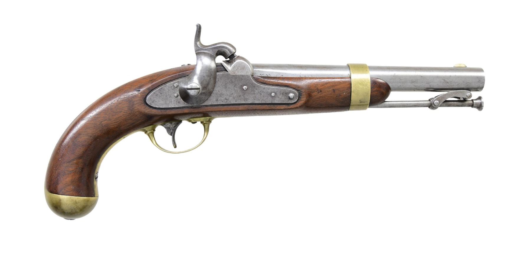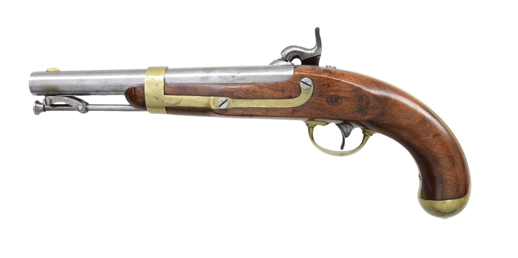 Cal. 54. NSN. Bbl. 8 1/2" round w/ brass blade sight. Lock is marked "U.S. H ASTON" forward of hammer & "MIDDtn / CONN. / 1850" behind hammer. Band fastened walnut stock w/ brass fittings. Button tipped iron swivel ramrod. Left ear of stock has 2 cartouches. Bbl. has inspector's marks "GW" & "JH". Approx. 24,000 dated 1846-50. CONDITION: metal is cleaned bright showing spots of light corrosion. Refinished stock shows scattered dents w/ small crack in sideplate area. Sound lock. Dark lightly pitted bore. (01-25939/DS). ANTIQUE. $800-1,200.