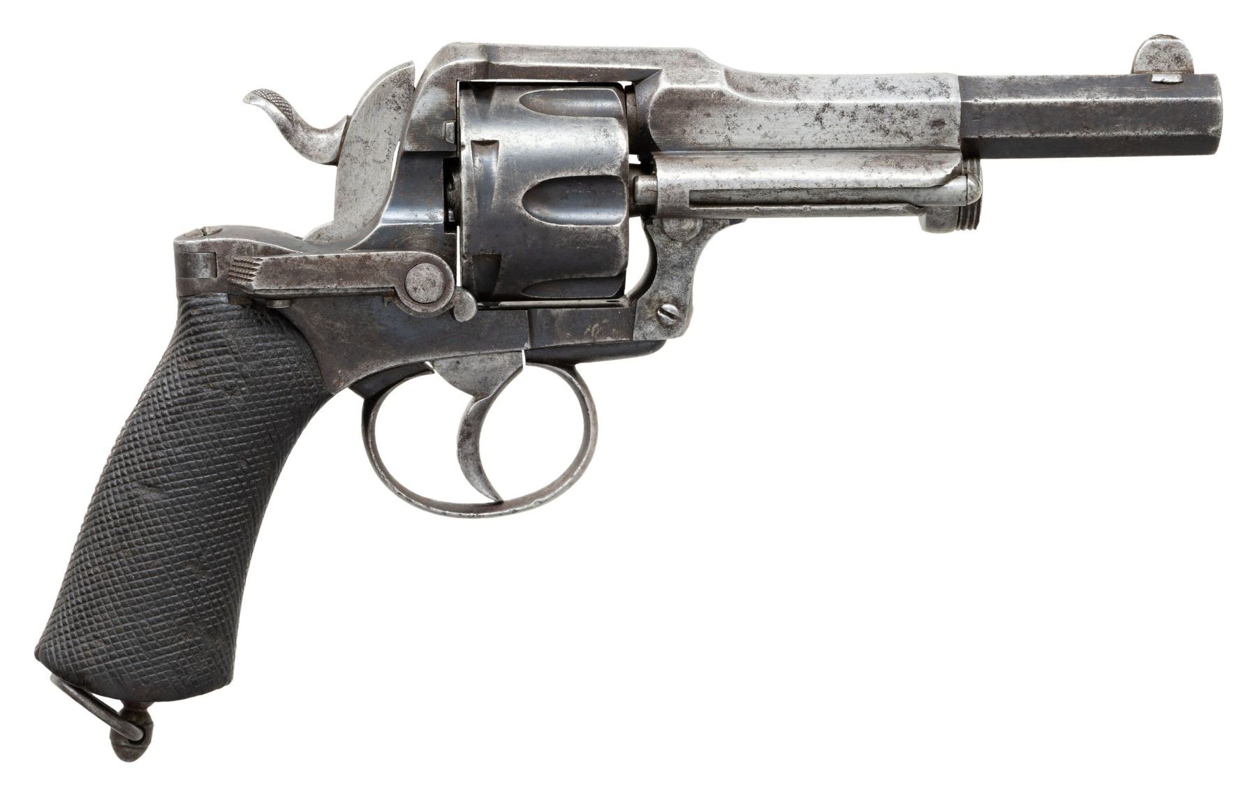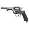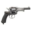 MAQUAIRE DOUBLE ACTION REVOLVER. Cal. 11mm. S# 9426. Bbl. 4 3/4". Fagnus Maquaire double action revolver mfg. in Belgium and retailed by H. Faure Le Page of Paris, France. The Fagnus Maquaire revolver closely resembles the French Model 1874 revolver, albeit with several notable improvements and external differences. The top flat of the octagonal bbl. is engraved "H Faure Le Page a Paris", with "Acier Fondu" (French: "Cast Steel") and the S# marked on the lower left quarter flat towards and at the breech. Rear face of cyl. exhibits 2 Belgian commercial proofs. Interior of the hinged frame sideplate is marked "C&D" within an oval, with research suggesting this to be the maker mark of either Clement & Dolmon or Colombier & Dumoulin. Metal components exhibit a blue finish overall, save for on the hammer and trigger, which are in-the-white. Frame is mounted with 2-piece checkered wood grips, featuring extensions of the checkering on the thin front and rear grip straps, as well as a lanyard swivel and ring on the butt. Thick dovetailed blade front sight with thinned upper edge and frame V-notched rear sight. CONDITION: metal components retain fair amounts of their original factory blue finish, exhibiting areas of wear fading to gray patina, with scattered spots of light to mild surface oxidation and pitting present overall. Bright bore, exhibiting scattered spots and patches of light to mild pitting, while retaining strong rifling throughout. Proper manual mechanics, with notably stiff hammer pull in SA mode. Grips show smoothing, as well as scattered marks and impressions from handling and storage, but otherwise remain sound. PROVENANCE: From the Buckstix Collection. (01-28593/MLW). ANTIQUE. $800-1,200.