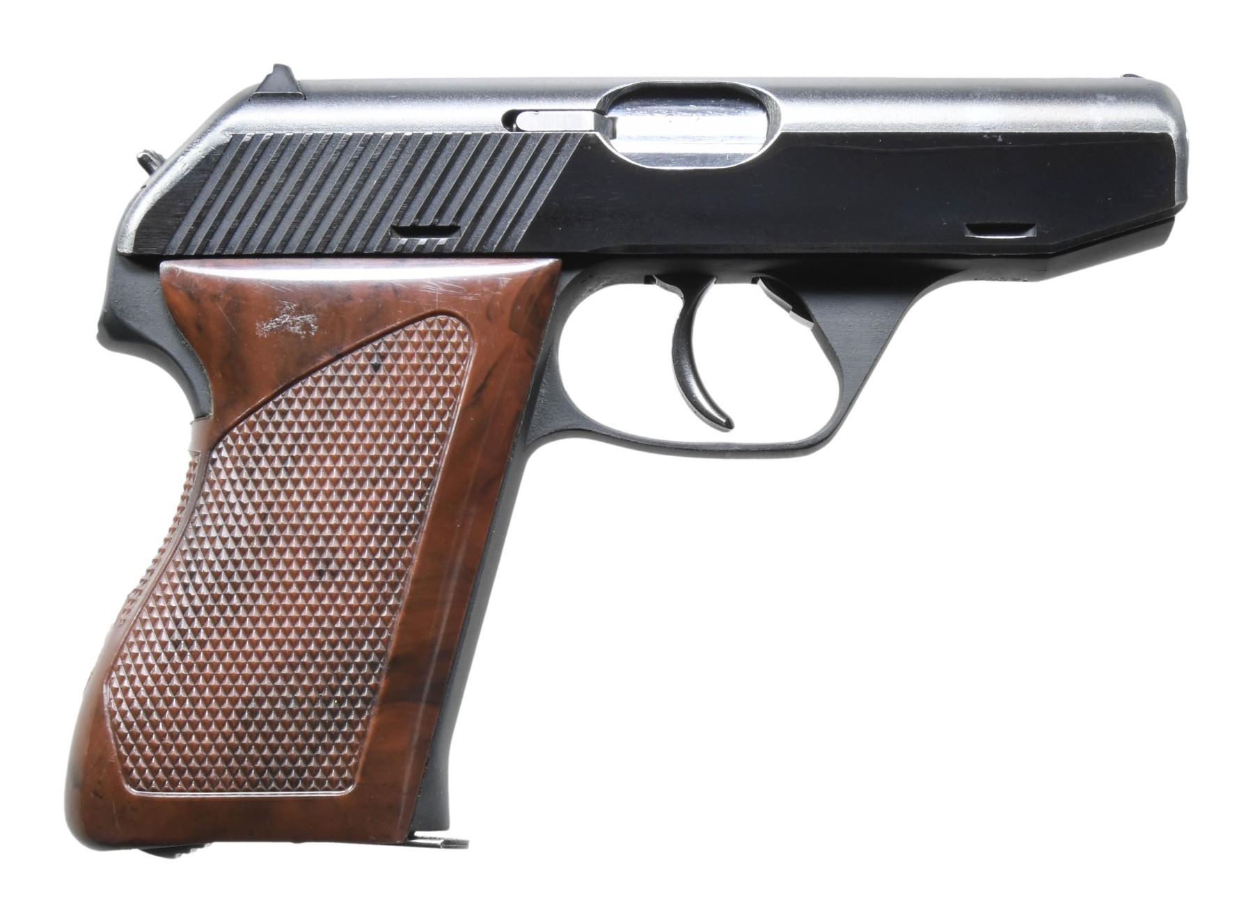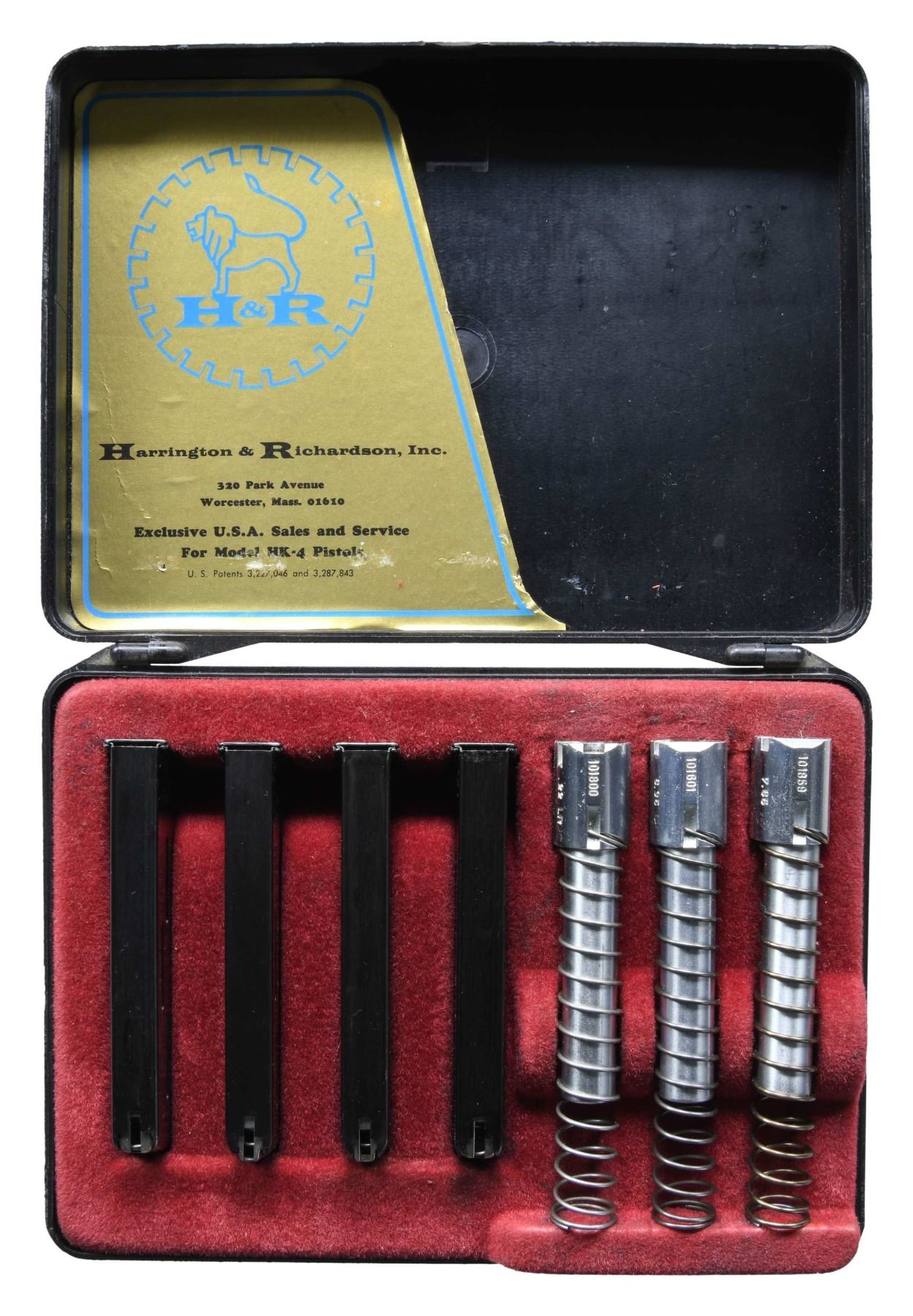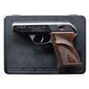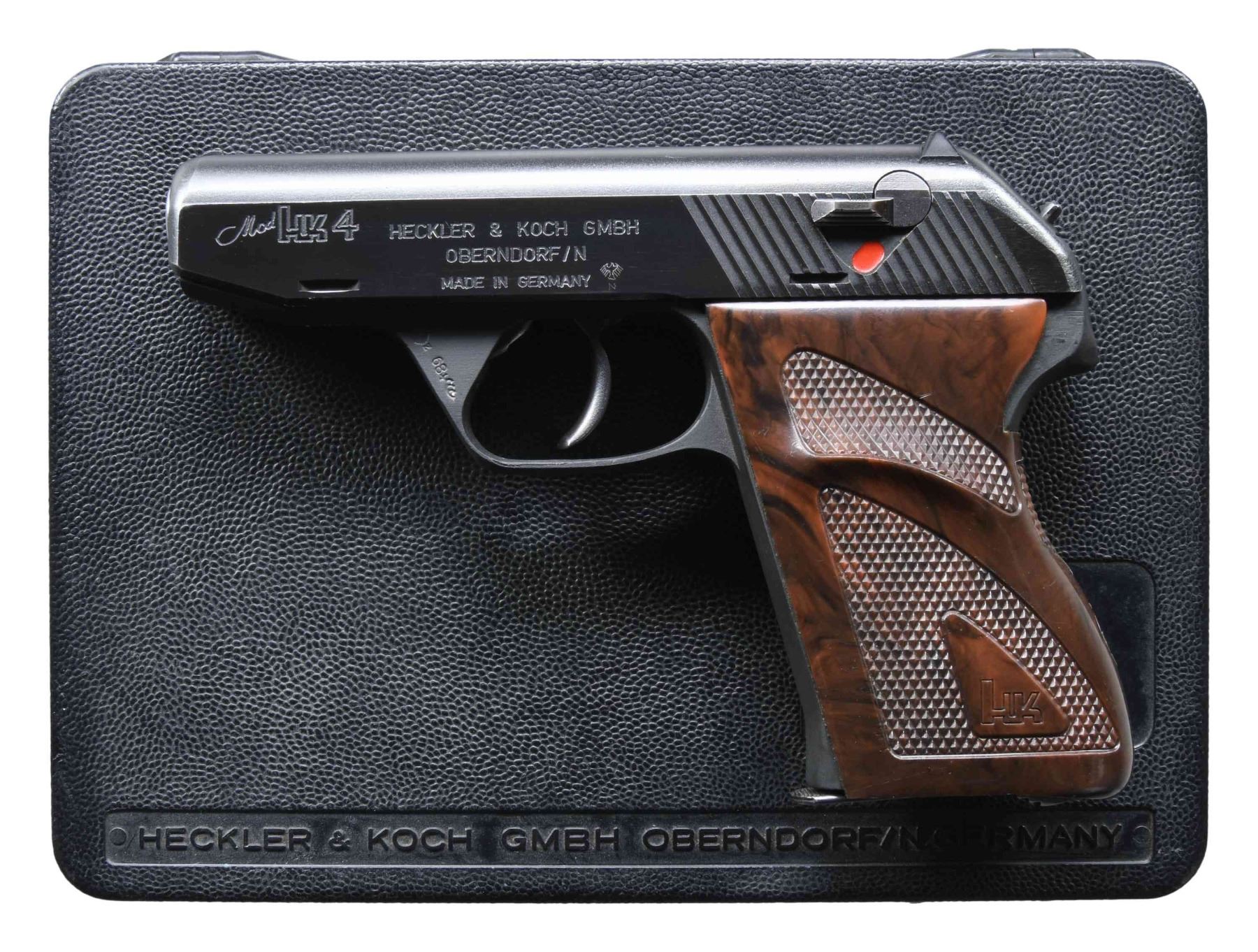 Cal. 9mm Kurz (380 ACP). S# 12004. Bbl. 3 3/8". Blade front sight. Square notch rear sight. 1989 proofed frame. Blued slide. Matte gray finished frame. Checkered brown plastic grips with HK logo & left side thumbrest. MAGS: 2-7 rd. 380 ACP, 1-8 rd. LR, 1-8 rd. 25 ACP & 1-8 rd. 25 ACP. Total of 5. UNATTACHED ACCESSORIES: matching numbered factory hardcase for pistol, cleaning rod, matching numbered factory hardcase with 32 ACP conversion kit, 25 ACP conversion kit & 22 LR conversion kit. CONDITION: grips show a few handling marks. Metal retains 97% matte gray & blued finishes with some light edge wear. Action functions properly when hand cycled. Bright near excellent bore. (25-2116/MJC). MODERN. $1500-2000.
