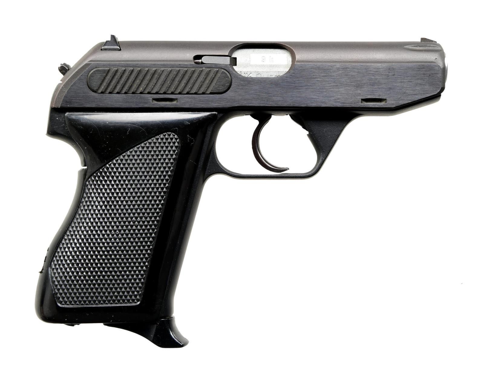 Cal. 380 ACP. S# 4-0045. Bbl. 3 1/4". Blade front sight. Square notch rear sight. Bbl. has "IG" date code denoting 1986 mfg. Blued slide. Black enamel frame. Checkered wraparound grip w/ HK logo. MAGS: 1-8 rd. UNATTACHED ACCESSORIES: unmarked, black two-piece box. CONDITION: grips show some light scratches & handling marks. Metal retains 97% blue & enamel finishes w/ some light edge wear on slide. PROVENANCE: the lifelong collection of Terrance McCarty. (24-269/MJC). MODERN. $400-600.