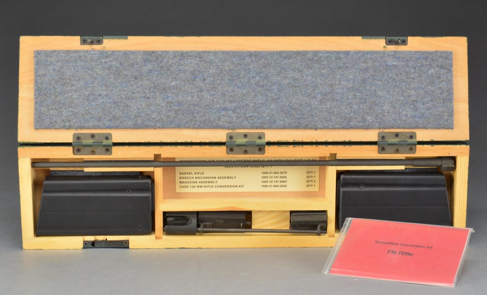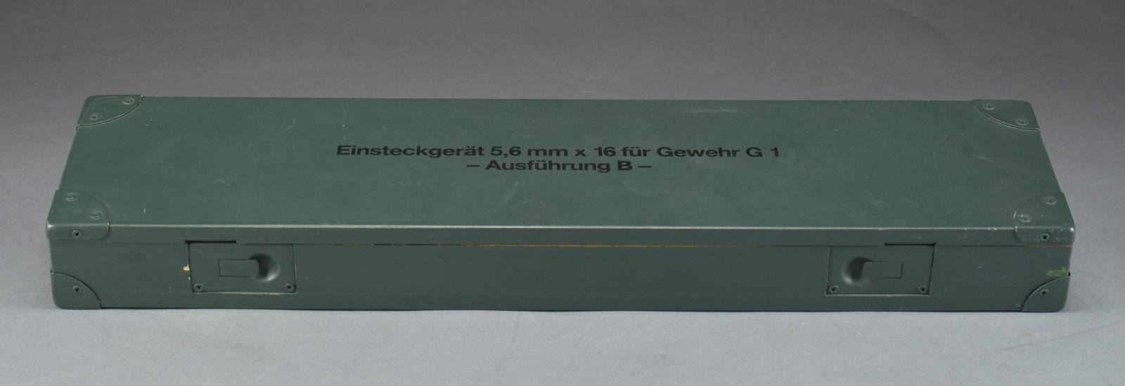 Mfg. by H & K for FAL use Oct. 1984 w/ matching numbered bolt & 21.6" bbl. insert. Dark satin green fitted case of hardwood having felt padding, German writing on lid, dual latches & 3 hinges. 4 Inner compartments to hold bbl. insert, replacement breech assembly & 2 full sized 20 rd. mags. w/ 22 LR inserts. Includes instruction booklet which notes designed for training purposes & will function w/ full auto bursts. CONDITION: all aspects near excellent appearing new & unused. (02-14084/NW). NON-GUN. $500-700.