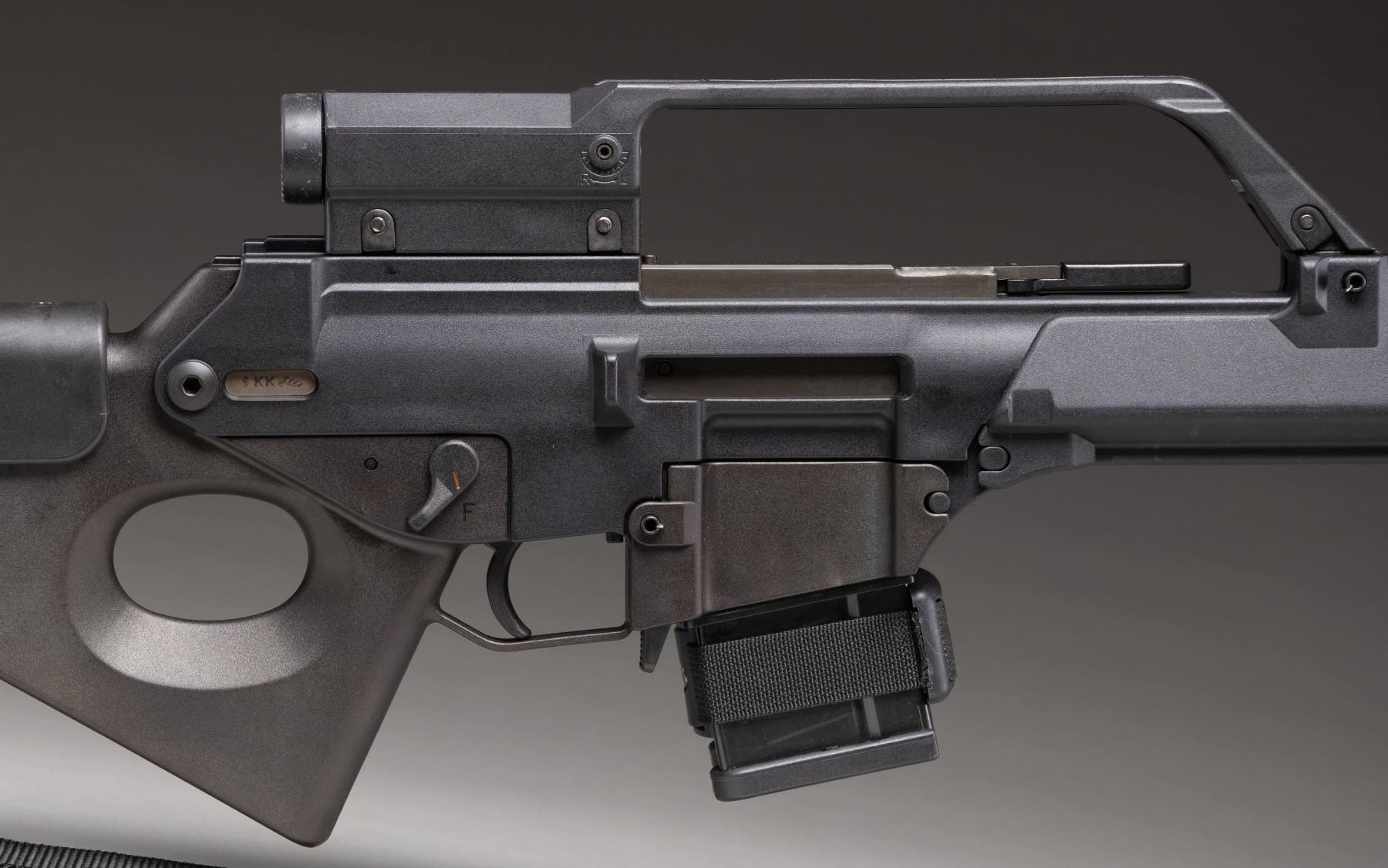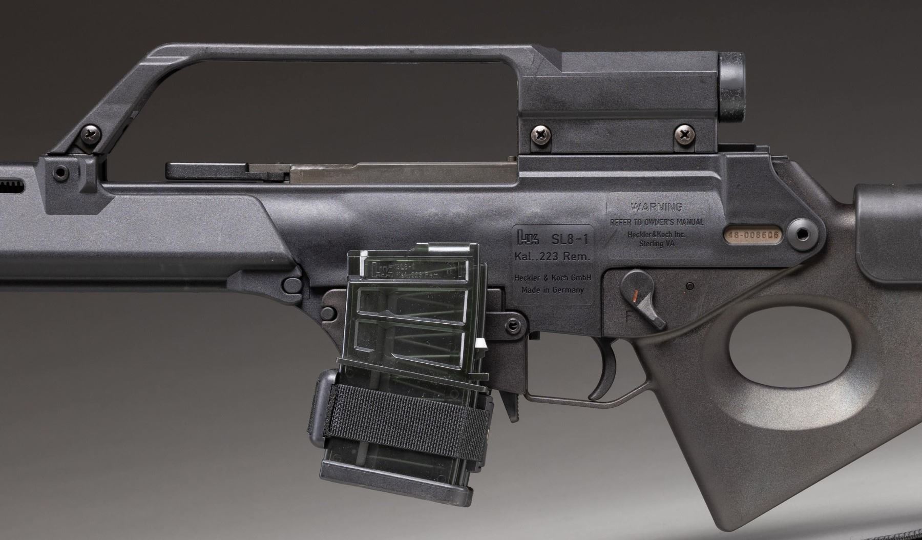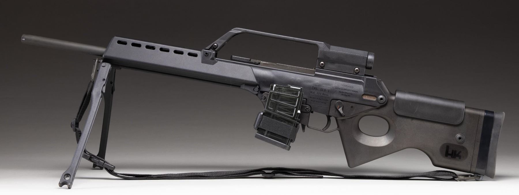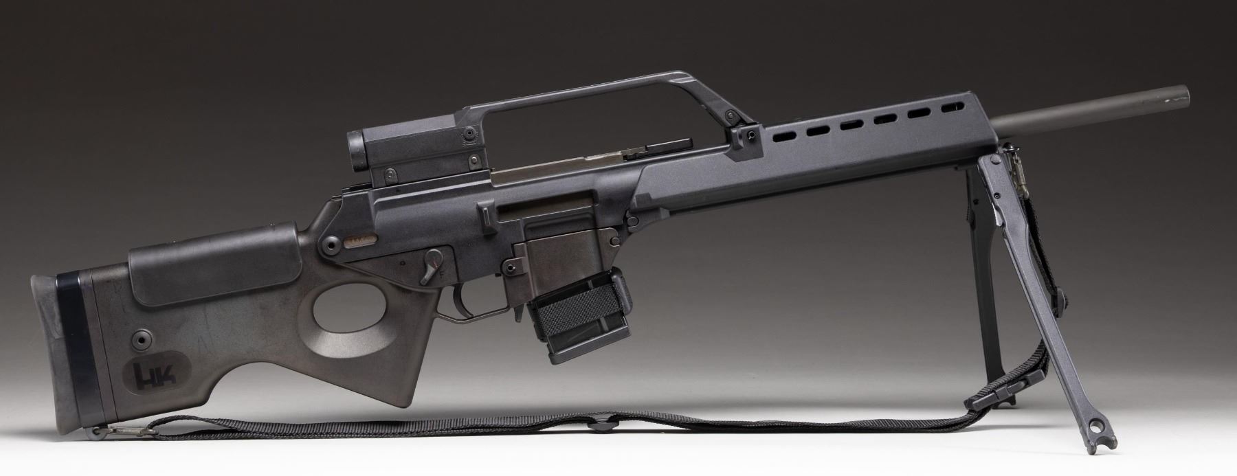 Cal. 223 Rem. S# 48-008606. Bbl. 20 1/2". Rifle is sighted with a carry handle optic. Very good optics & rubber eyepiece shows some staining. Civilian sporting version of the famed G36 rifle. Right rear of receiver has "KK" date code denoting 1999 mfr. Ambi safety. Gray phosphate bbl. Balance of other parts have matte black finish. Black polymer furniture with H&K marked thumbhole stock. Bottom mounted sling swivels with black nylon sling. Folding bipod present on underside of forend. MAGS: 2-10 rd. with Velcro coupler. CONDITION: bbl. shows scattered edge wear. Other metal parts & furniture show some handling marks & operational wear. Action functions properly when hand cycled. Bright near excellent bore. (25-3883/MJC). MODERN. $700-1,100.
