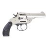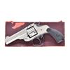 Cal. 32 S&W. S# 251029. Bbl. 3". This 3rd variant has fixed sights, nickel finish w/ blued triggerguard and hard rubber grips. UNATTACHED ACCESSORIES: hinged factory box with end label matching revolver but no S# on the box. Box has split corners, flaking paper & section of lid detached but included. Interior label is solid. CONDITION: nickel coverage is about 95% factory with some scratches and marks. Grips are solid with a small dent. Bore is fair to good, solid rifling but light pitting and dull. (22-5341/CW). CURIO. $200-300.