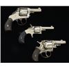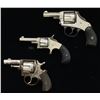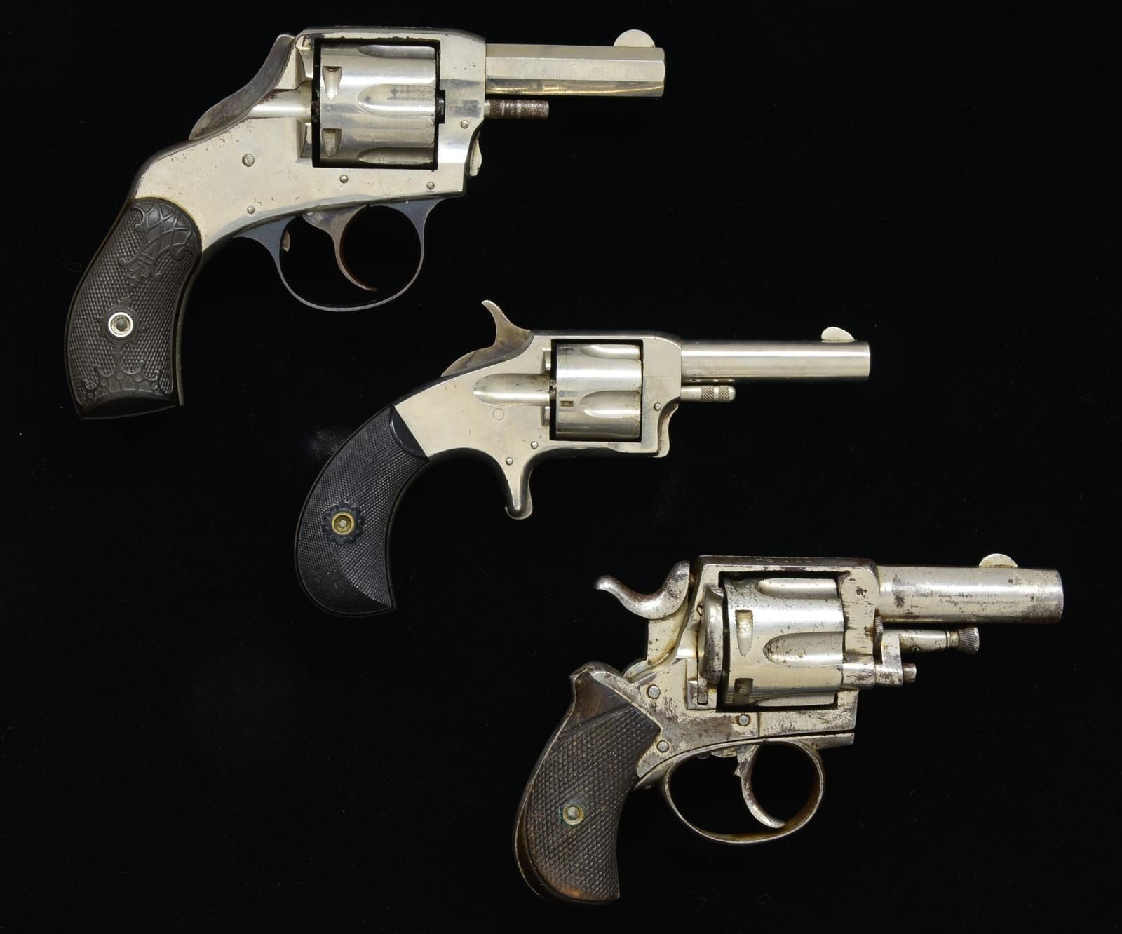 1) HARRINGTON & RICHARDSON SAFETY HAMMERLESS DA. Cal. 32 S&W. S# 37481. Bbl. 2 1/2" oct. w/ semi circular sight. 6 Shot fluted cyl. Nickel finished w/ blued triggerguard. Case colored trigger & spurless hammer. CONDITION: 80% nickel showing spots of finish loss & handling marks. Grips show light wear & handling marks. Sound mechanics. Bore retains sound rifling. (21-320/DS). 2) AETNA NO. 2 SA. Cal. 32 RF. S# 9162. Bbl. 2 1/2" rnd. w/ blade sight. 5 Shot fluted cyl. Solid frame spur trigger action. Nickel finished w/ case colored hammer & trigger. 2 Piece checkered hard rubber rnd. butt grips. CONDITION: 90% nickel. Very good grips. Sound mechanics. Bore retains good rifling showing spots of pitting. (21-321/DS). 3) BRITISH BULLDOG DA. Cal. 38 CF. NSN. Bbl. 2 1/2" w/ semi circular sight. 6 Shot fluted cyl. Solid frame DA action. Nickel finish. 2 Piece checkered walnut bird's head grips. CONDITION: 50% nickel. Grips show heavy wear. Functioning mechanics. Dark pitted bore. (21-322/DS). ALL CURIO. $300-600.
