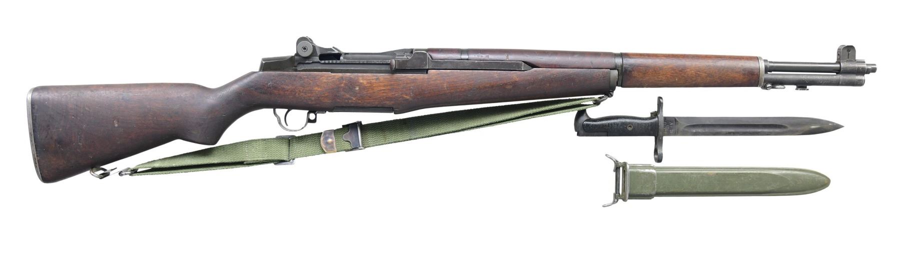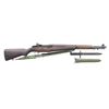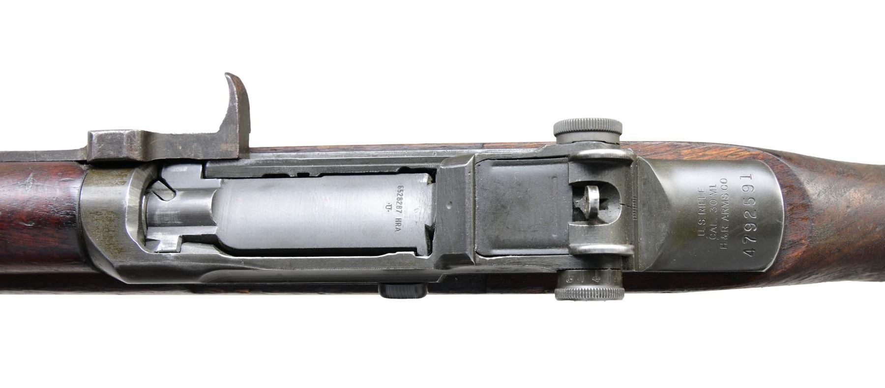 Cal. 30-06. S# 4792591. Bbl. 24". HRA-marked and 6-54 dated. Throat gauges less than 1.0. Muzzle gauges 2.0. Blade front sight with protective ears. T105E1 adjustable aperture rear sight with HRA marked adjustments. Trigger housing, safety, hammer, gas cyl. plug, operating rod, and bolt are all HRA-marked. Parkerized finish. Floorplate has "106" marking in black marker. Walnut stock set with bottom-mounted sling swivels and canvas GI sling. Stock has distinctive H&R "back porch" behind receiver. Right side of stock has partially faded 3/8" "DOD Eagle" cartouche. Underside of pistol grip has circled "P" firing proof. UNATTACHED ACCESSORIES: AFH M1 bayonet with unmarked scabbard. CONDITION: stock set shows a couple chips, scattered dings, handling marks, and scratches. Metal shows a fading arsenal parkerized finish with overall fading to gray, a couple patches of pitting, some light oxidation, and scattered edge wear. Action functions properly when hand-cycled. Very good, bright bore. (24-5833/MJC). CURIO. $900-1,200.