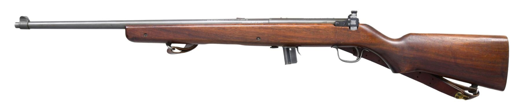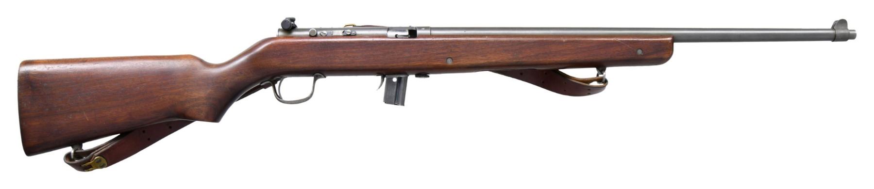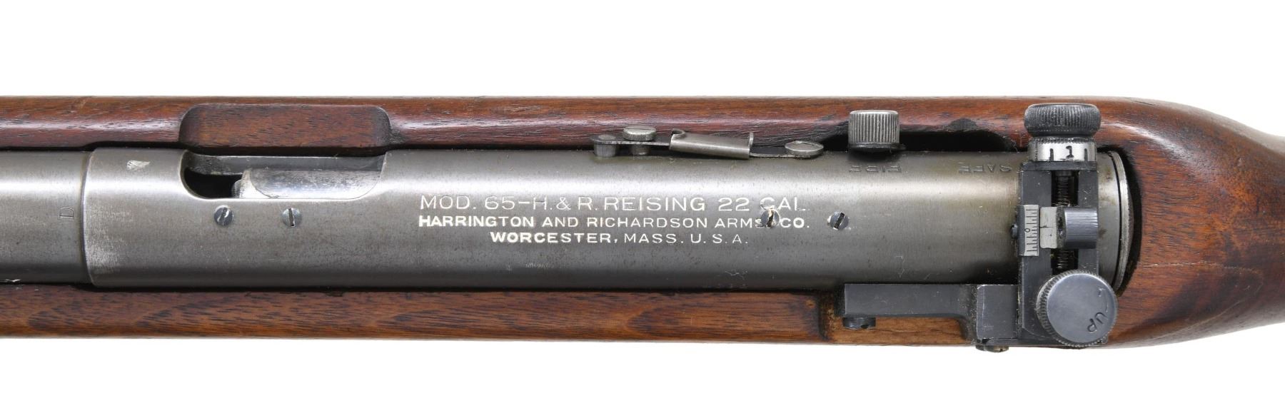 Cal. 22 LR. S# 4032. Bbl. 23". These training rifles were designed to approximate the weight sight picture & balance of the US M1 Garand rifle. Manufactured in the late WWII era. These rifles were used for training by the United States Marine Corp. Receiver is fitted w/ the original Redfield aperture rear sight. The slide is graduated to 60 points & the sight is equipped w/ Target type knobs. Blade front sight w/ protective ears. Receiver is marked on top "MOD. 65-H.&R. REISING 22CAL / HARRINGTON AND RICHARDSON CO. / WORCESTER, MASS. U.S.A.". Bbl. marked on left side "MFG. BY HARRINGTON AND RICHARDSON ARMS CO. / WORCESTER, MASS. U.S.A. / 22 LONG RIFLE ONLY". Bbl. is marked on top over chamber w/ "D". Receiver has been drilled on top for scope mount & is equipped on the right side w/ a sliding bolt hold-open device. Walnut stock. Forend is slotted for operating handle. Flat steel buttplate. Brown leather military style sling. MAGS: 1 detachable 10 rd. Magazine is marked "H&R ARMS CO." & has indicating holes for 8 and 10 rds. CONDITION: stock has moderately worn original finish w/ numerous handling marks throughout. Metal has a grey-green Parkerizing w/ light wear & notable scratch on the right front of the receiver. Very good shiny bore. (25-2160/RW). CURIO. $400-600.