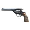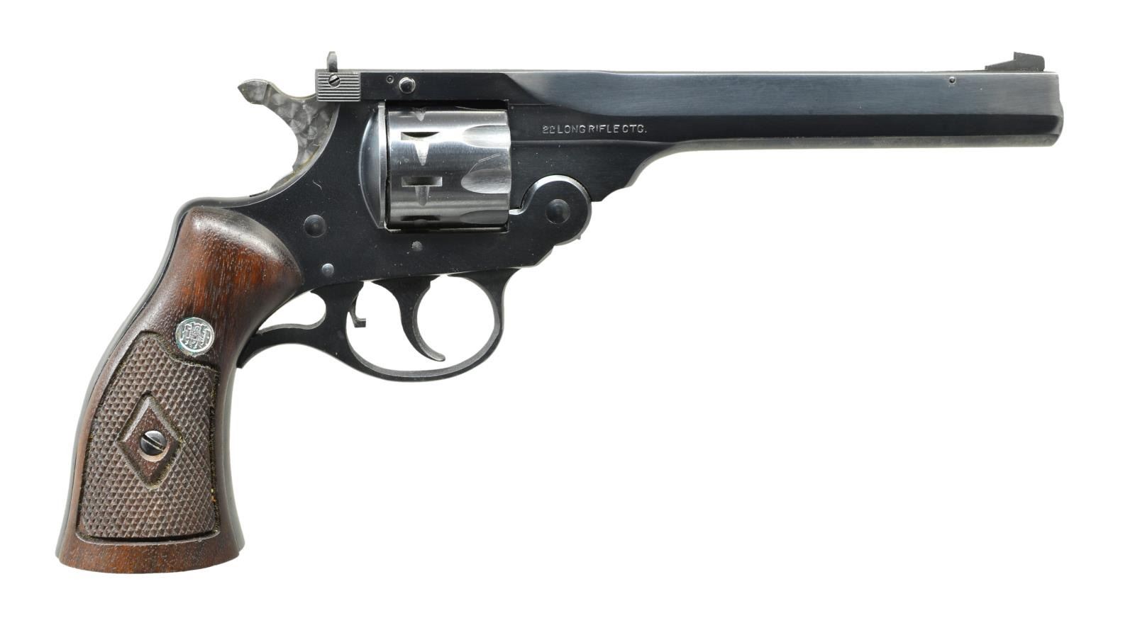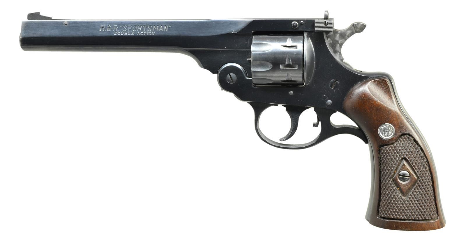 Cal. 22 LR. S# R13283. Bbl. 6" w/ tapered sides having matte top plus elevation adj. Patridge sight; windage adj. rear on bbl. latch. Mfg. 1955 (1953-1972) w/ blued finish, jeweled sides of hammer & checkered diamond center walnut grips having H&R medallions plus RH thumb relief. Generally referred to as Model 999 Second Model Sportsman New Frame top break. 9 Rd. matching numbered fluted cyl.; matching numbered bbl. & latch. CONDITION: all aspects near excellent w/ new unfired appearance. PROVENANCE: Estate Collection of Kenneth Horn (Grandson of JC Higgins). (22-426/NW). CURIO. $400-600.