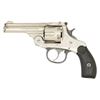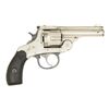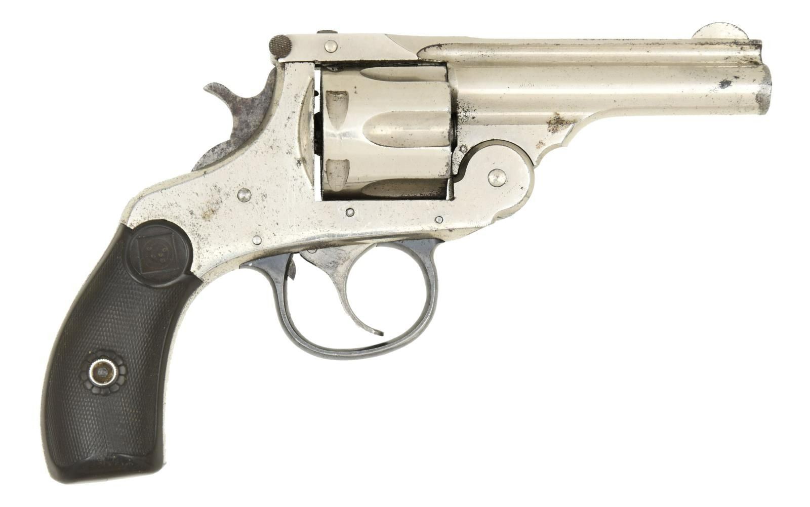 Cal. 32 S&W. S# 100845. Bbl. 3". Round blade front sight. Fixed rear sight. Right side of bbl marked "AUTO EJECTING 32 S&W CTG". Last patent date on bbl. is April 7th, 1896. Nickel finish. Target logo grips. CONDITION: bottom of right grip panel shows a notable chip. Grips otherwise show worn checkering, a crack on bottom of right panel & some handling wear. Metal shows scattered scratches, dings & oxidation. Bore shows scattered pitting & oxidation but evident rifling. Provenance: From the Estate of Harry Henry. (23-5115/MJC). CURIO. $100-200.
