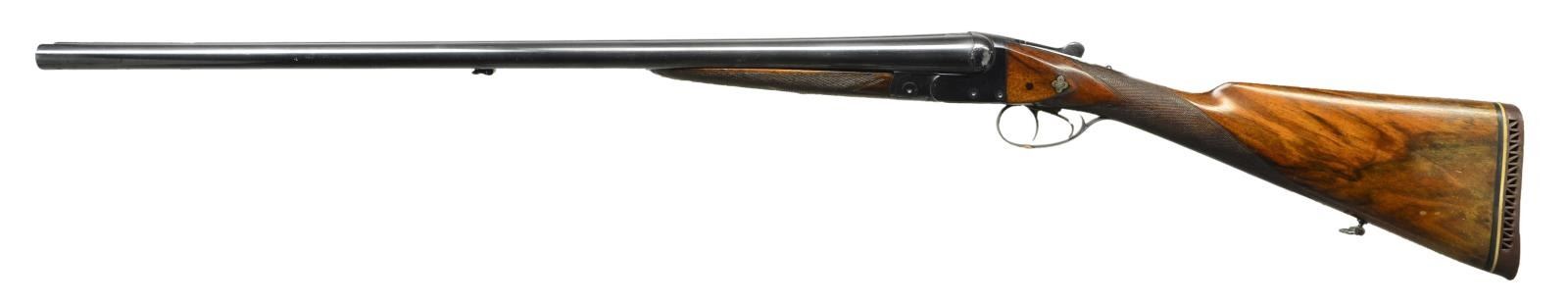 Cal. 12 Ga., 2 1/2". S# 500. Bbls. 27 1/2"; both choked FULL. Matching numbers on forend iron and right barrel; 1057 between barrels under forend. Standard French proofs. Barrels joined without sighting rib except for small section at breech; brass bead at muzzle below tops of barrels. Boxlock action with non automatic SUR marked safety, double triggers, side clips, non bushed firing pins and ejectors (only left functions). Straight gripped buttstock with brown White Line ventilated Pachmayr pad curved to match original stock contour; appears stock not cut having present LOP of 14 1/2". Checkered stock set having wrap around panel on push button release forend plus long inletted trigger guard tang. European style 3/4" swivels on barrels and buttstock. CONDITION: very good overall appearance as refinished. Some active heavy spots of oxidation on inside and outside of trigger guard. Light hand wear to stock set with added finish. Reblued metal with traces of prior marks and light pitting. Action somewhat loose but locks tight with .004" paper inserted at breech and acts tight with forend installed. Buttstock repair on left panel. Generally bright bores cleaned of prior light pitting and still retaining numerous light dents and wavy patterns in right barrel. PROVENANCE: Estate of Frank Glenn Marsh. (22-3365/NW). CURIO. $500-700.