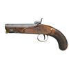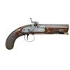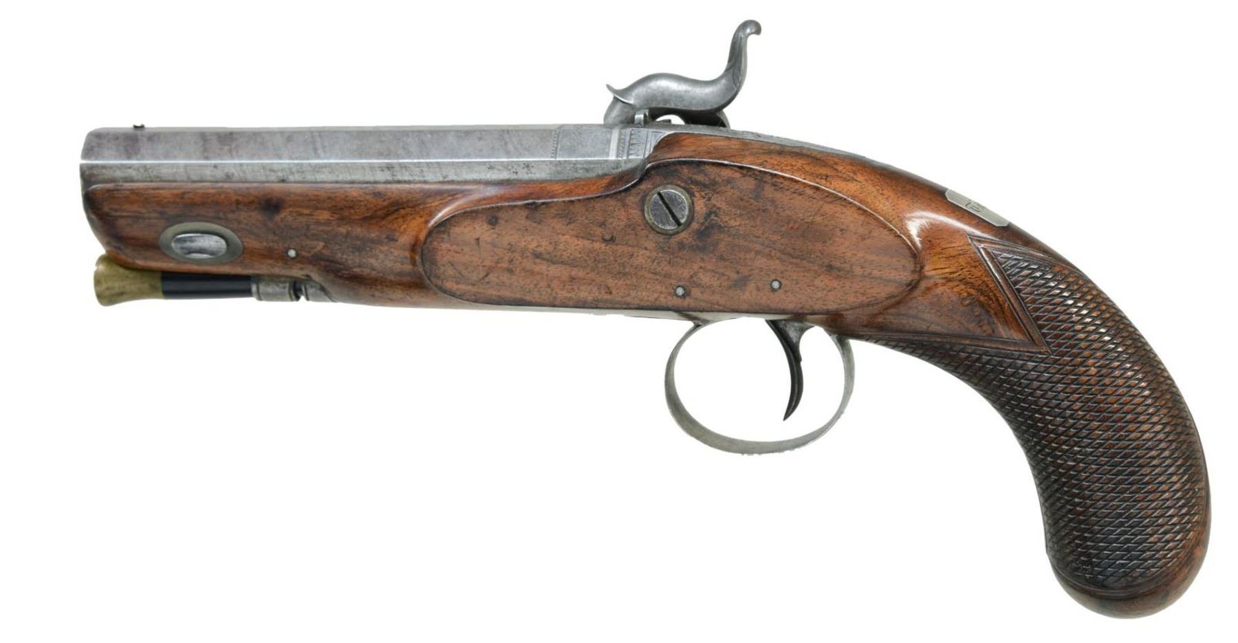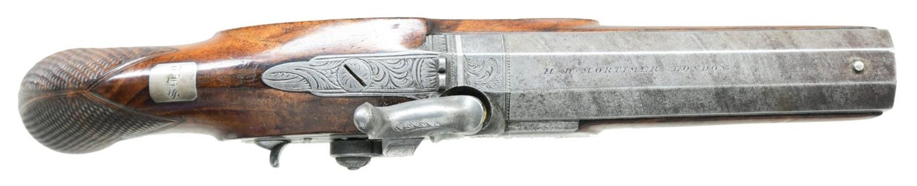 PISTOL. Cal. 54. NSN. The 4" twist steel octagon barrel is engraved "H.W. MORTIMER LONDON" on top flat. Breech, without blowout has platinum band at rear and some scroll engraving. Scroll engraved breech iron has integral "V" notch rear sight. Front spring percussion lock with flat faced serpentine hammer is also engraved with well cut scroll. Lock is fitted with back sliding safety which engages at half cock. Maker's name is engraved on front portion of lockplate. European walnut stock with flat checkered bag grip extends to muzzle and attaches to barrel with single captive side bolt through oval silver escutcheons. Scroll engraved trigger guard has stylized pineapple finial. A rectangular silver crestplate at top of grip is engraved with the initials "THS". Rosewood ramrod with brass tip and tail mounts through single slotted iron thimble. CONDITION: good. Metal parts cleaned to pewter gray over scattered light frosted surfaces. Stock retains most of its original finish with many minor marks. Bore is bright with some light rusting toward muzzle. Mechanically fine. Harvey Walklate Mortimer was a very highly regarded London gunmaker working between 1780-1819. This pistol was probably made by his son, also H.W., who worked until 1823. (01-21857/MGM). ANTIQUE. $1,200-1,800.