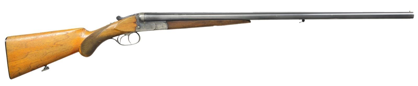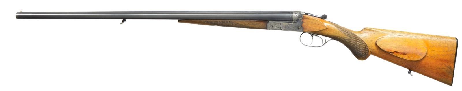 Cal. 16 Ga. S# 62547. Bbls. 28 3/8" matted solid rib w/ brass front bead, 2 3/4" chambers & choked “FULL” & “FULL”. Matching S#s, dbl. triggers, pin cocking indicators & extractors. Frame, fences, lever & trigger guard feature tasteful scroll engraving. Checkered splinter forend & round knob semi pistol grip stock w/ raised cheek rest, sling swivels & 13 1/4" & 14 1/4" LOP to buttplate. Importer marked. UNATTACHED ACCESSORIES: black plastic case. CONDITION: bbls. retain about 90% blue, frame has trace case color under the lever, some flaking & fine spots of pitting. Stock set has been sanded & has an added coat of finish w/ scattered light dings & dents. Bores are very bright w/ a few fine pits. PROVENANCE: "Save the Fine Guns". T&G German Gun Imports, bringing fine German guns to a more appreciative market. (22-5092/CW). MODERN. $300-500.