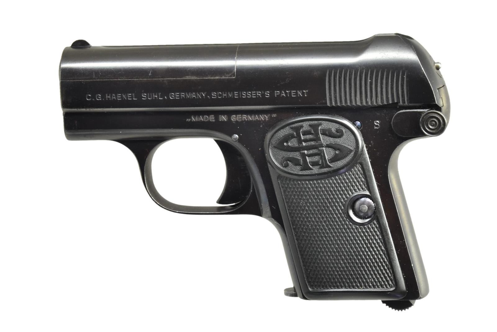 Cal. 6.35mm (25 ACP). S# 36866. Bbl. 2". Mfg. in Suhl Germany from 1922-1930. Quality workmanship based on Baby Browning. Left side above trigger has "MADE IN GERMANY" export mark. Border checkered hard rubber grips w/ intertwined HS logo. Crown N proofed & matching numbered slide. MAGS: 1 very good to excellent 6 rd. CONDITION: all aspects near excellent including bore & grips. PROVENANCE: Estate Collection of Kenneth Horn (Grandson of JC Higgins). (22-449/NW). CURIO. $350-500.