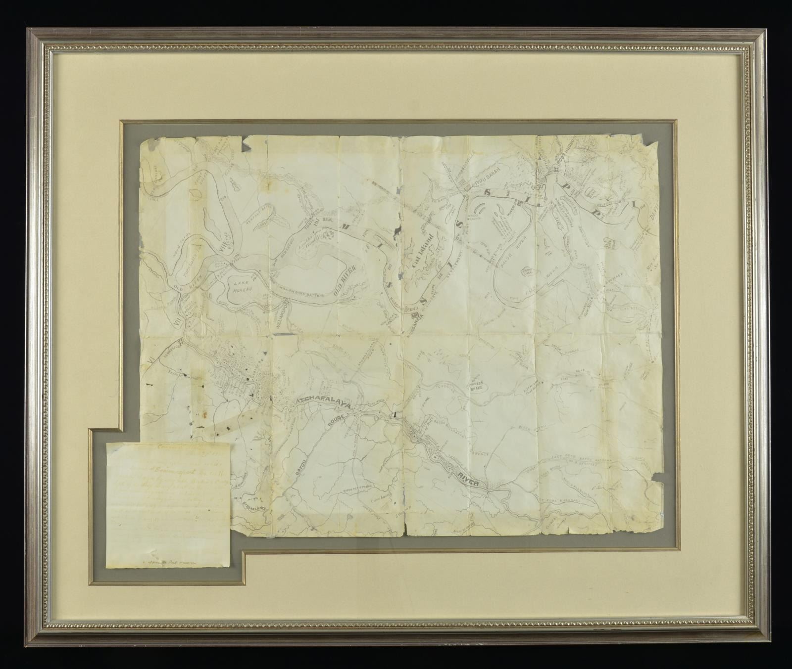This map measures approximately 23” x 17 1/2" and the frame housing it measures 32 1/2" x 27 1/2". The map appears to show the area west & north of Port Hudson including The Mississippi River, The Atchafalaya River, Cat Island, Bayou Sarah, The Old River, Bayou Rouge, Williamsport, and Semmesport. It is an ink-drawn map that appears to be of the Civil War period. An accompanying tag framed with the map is dated June 25, 1908 and attests that the owner was given the map at Semmesport on the Atchafalaya River by Major General Banks Commanding the Department of the Gulf. The note goes on to talk about a company of cavalry and a battery of artillery joining the 13th Connecticut Volunteers on the right bank of The Mississippi River. The note is very lightly signed at the bottom but under black light the signature of Captain Apollos Comstock becomes apparent. CONDITION: the map itself remains exceptionally clear and easy to read. The edges are frayed and there are a few small holes. Most folds and edges have been reinforced with tape possibly of archival quality. The map has not been examined out of the frame. The note is quite lengthy but very light and difficult to read without the aid of a black light. An exceptionally historic map worthy of expanded research. (02-16912-1/BF). $500-800.