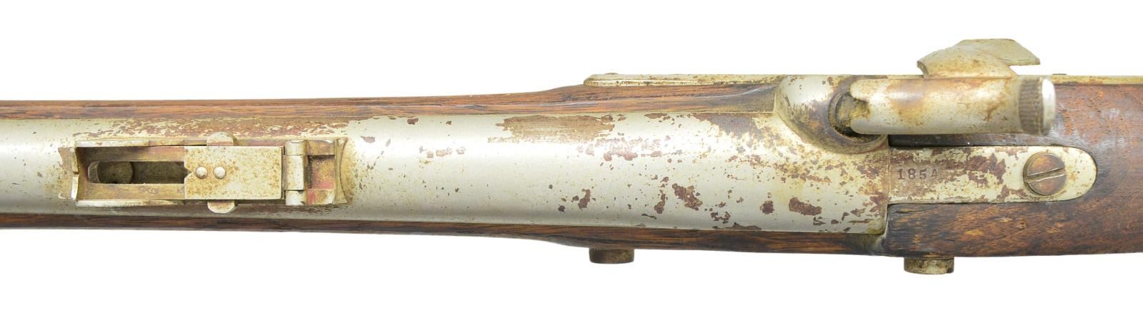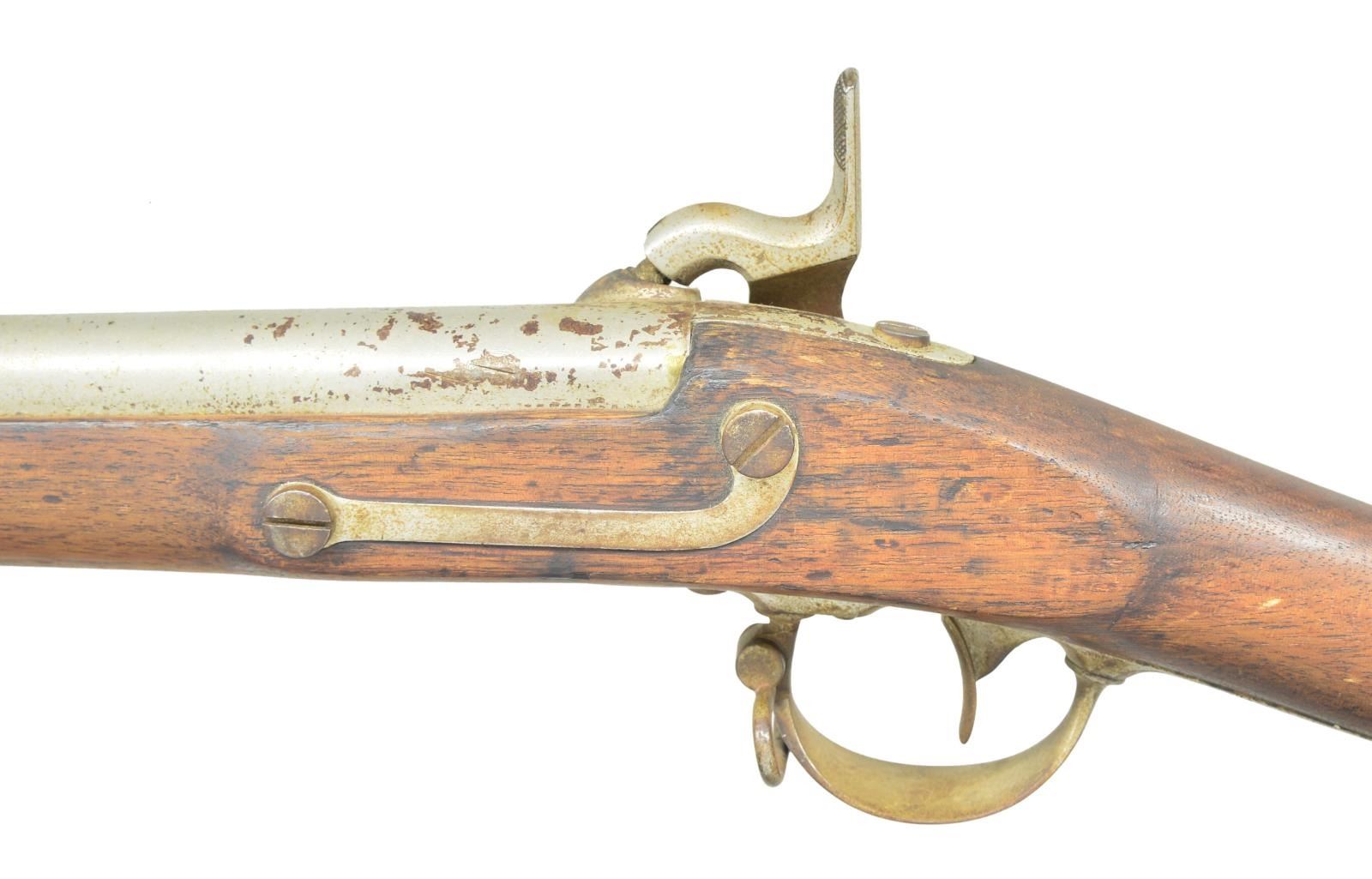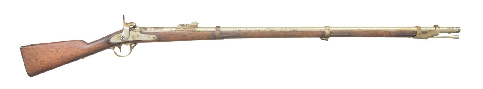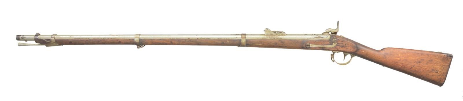 Cal. 69. NSN. Bbl. 42". 1842 Harper's Ferry musket that was arsenal altered to rifle musket config. w/ rear sight graduated to 800yds. & blade front sight. Lock has eagle, Harper's Ferry & 1855 markings. Upper tang dated 1854. Bbl. has faint VP proof. Hammer is missing lock screw. Walnut stock w/ 3 bands, bottom mounted sling swivel & trumpet shaped ramrod. CONDITION: sanded stock shows a few chips in ramrod channel, scattered dings & handling marks. Metal has an old nickel finish w/ scattered flaking & oxidation. Oxidized & pitted rifled bore. (01-22287/MJC). ANTIQUE. $1000-1500.
