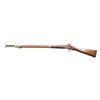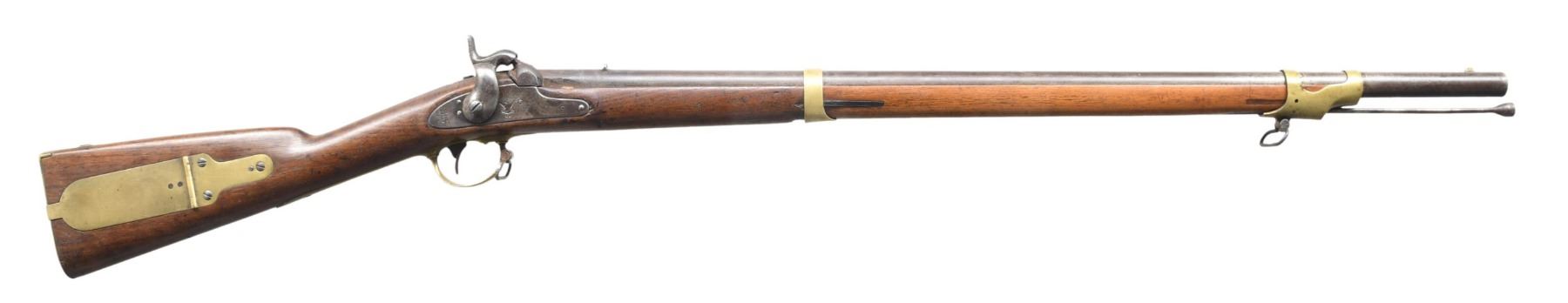 PERCUSSION RIFLE. Cal. rebored from 54 to 58. NSN. Bbl. 33" round w/ rifled bore. Fixed sights. Harper's Ferry marked lock is dated "1854". 2 band fastened stock w/ brass furniture. Tulip tipped iron ramrod. 25,296 mfg. 1846-55. CONDITION: metal has faded gray appearance w/ pitting & wrench marks in the breech area. Butt section of stock shows wear w/ dents & marks having chips & cracks in tang & sideplate areas. Forearm between bbl. bands is replacement w/ wood filler in spring slot bore front band. Lock shows wear. Bore has dark frosted appearance w/ worn rifling having a very light ring approx. 4" from the muzzle. PROVENANCE: ex-collection of Paul Eseppi. (01-25931/DS). ANTIQUE. $1,800-2,500.