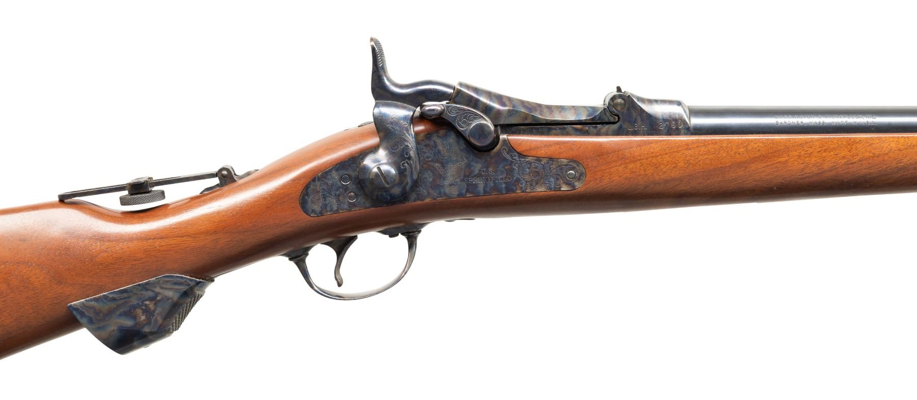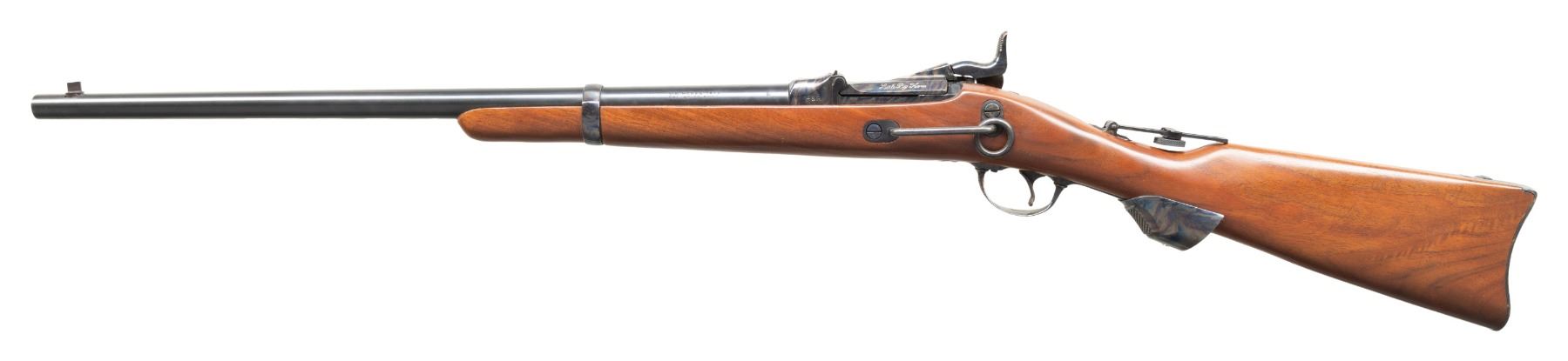 TRAPDOOR CARBINE. Cal. 45-70. S# LBH2760. Replica of the Springfield 1873 Trapdoor Cavalry Carbine. Bbl. 22". Blade front sight & vernier sight installed into stock. Blued & case colored finish. Carbine stock w/ grip adapter. CONDITION: near excellent overall appearance with minor light handling marks. Near excellent rifling. PROVENANCE: From the PMRB Collection. (25-5996/MD). MODERN. $600-900