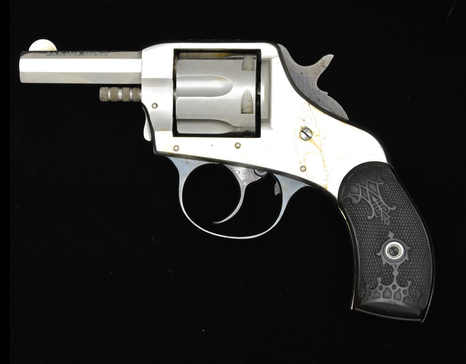 Cal. 32 RF. S# 234 (under left grip panel). Mfg. 1898-1904 as similar 4th variation of the American Double Action First Model, but w/ top strap marked "THE H. & R. / BULL DOG" . Bbl. 2 1/2" oct. w/ half moon front sight & H&R address on left flat. Nickel finish w/ blued trigger guard; case colored hammer & trigger. 2 Piece hard rubber grips. CONDITION: very good overall metal w/ light brown staining streaks throughout, minor handling marks & oxidation. Cyl. has 1 lg. area of missing nickel leaving pitting. Very good grips. Very good bore w/ area of pitting. PROVENANCE: Estate Collection of Kenneth Horn (Grandson of JC Higgins). (22-393/MD). CURIO. $300-400.