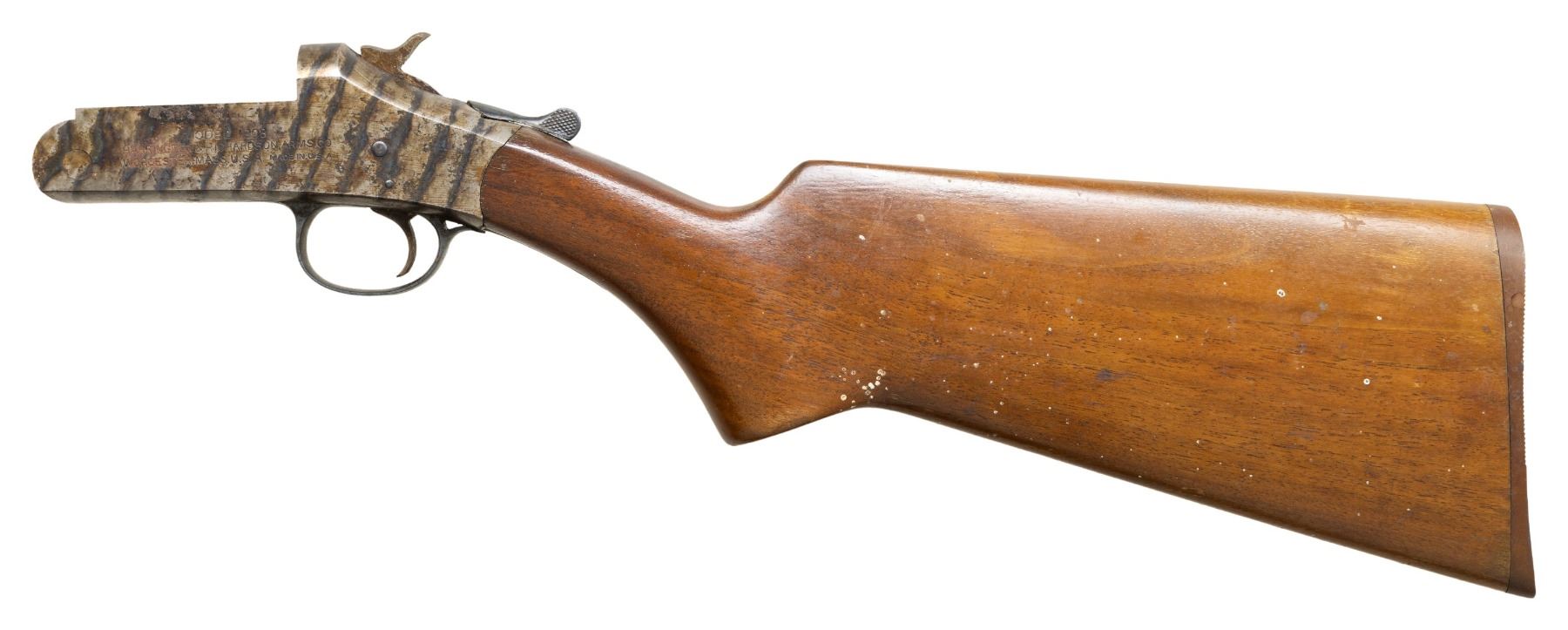 ACTION. S# 232175. Single barrel case colored action w/ top lever & external hammer. Walnut stock. CONDITION: good case colors with oxidation. Good wood finish with white paint. PROVENANCE: Estate of Groves Herrick. (25-5651/MD). MODERN. $40-60.