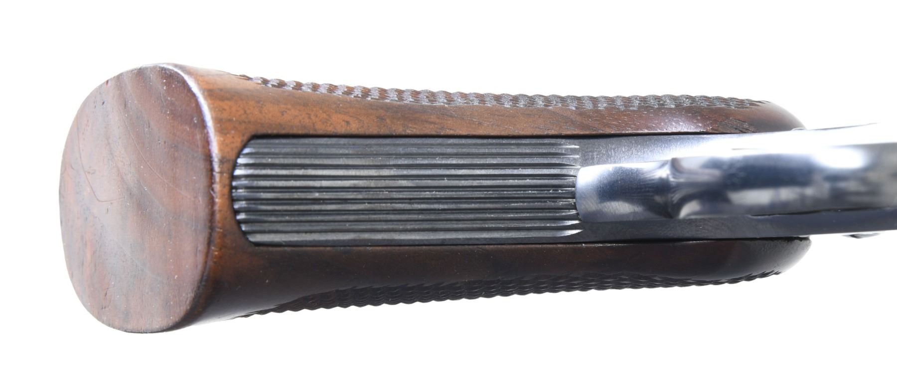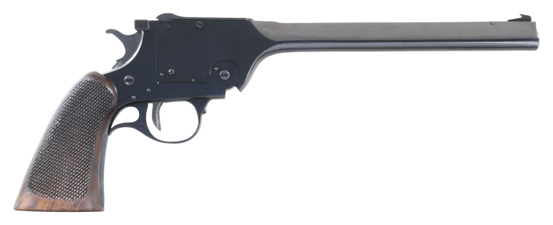 SHOT TARGET PISTOL. Cal. 22 LR. S# 2443. Bbl. 10". heavy with hooked Patridge front sight and 2nd style raised wing rear. Mfg. 1928-1941, total production is estimated to be only a few thousand. These pistols were mfg. as competition for Colt's vaunted Camp Perry pistol with Walter Roper overseeing development. This pistol features the straight serrated trigger, high checkered hammer, and serrated rectangular bbl. latch. Serrated front grip strap. Checkered wraparound grips. CONDITION: very fine overall retaining 95% original blue with a few scattered light handling marks. sides of bbl. display a couple areas of fine peppery oxidation. Near excellent grips. Mint bore. (25-1621/BH). MODERN. $800-1,200.