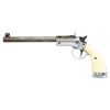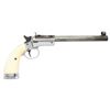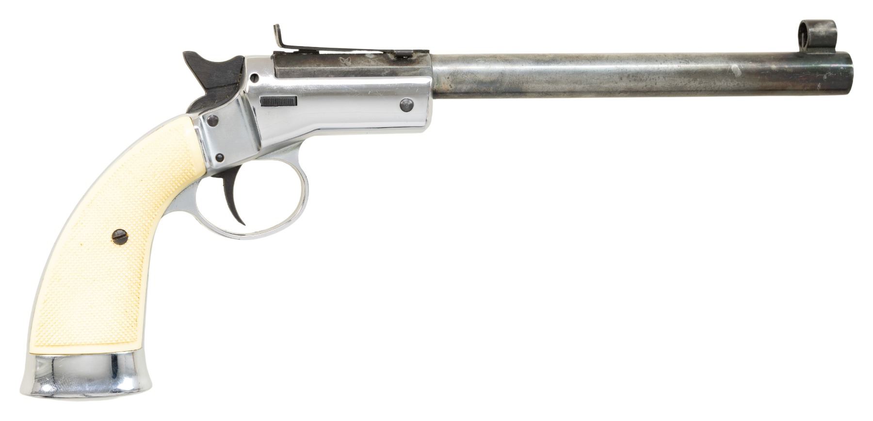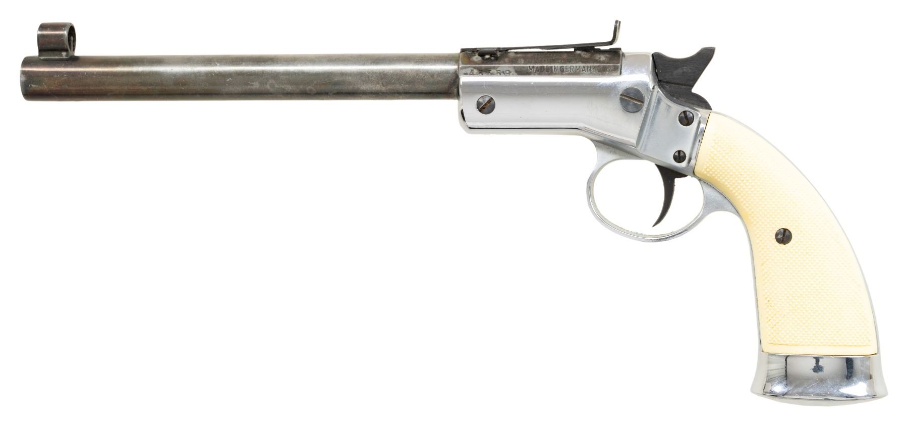 Cal. 22 LR. S# 45559. Bbl. 8". Hooded bead front sight. Sporting style rear sight. German made target pistol similar to Steven's Favorites. Bbl. Appears blued. Frame, trigger guard & grip assembly are nickel finished. Checkered white plastic grips. CONDITION: grips show some staining & handling marks. Bbl. retains 30% blue with overall fading to gray, some oxidation, handling marks & overall edge wear. Nickel parts retain 97% finish with scattered handling marks & light scratches. Action functions properly when hand cycled. Very good bore with strong rifling. PROVENANCE: Estate of Groves Herrick. (25-5688/MJC). CURIO. $100-200.