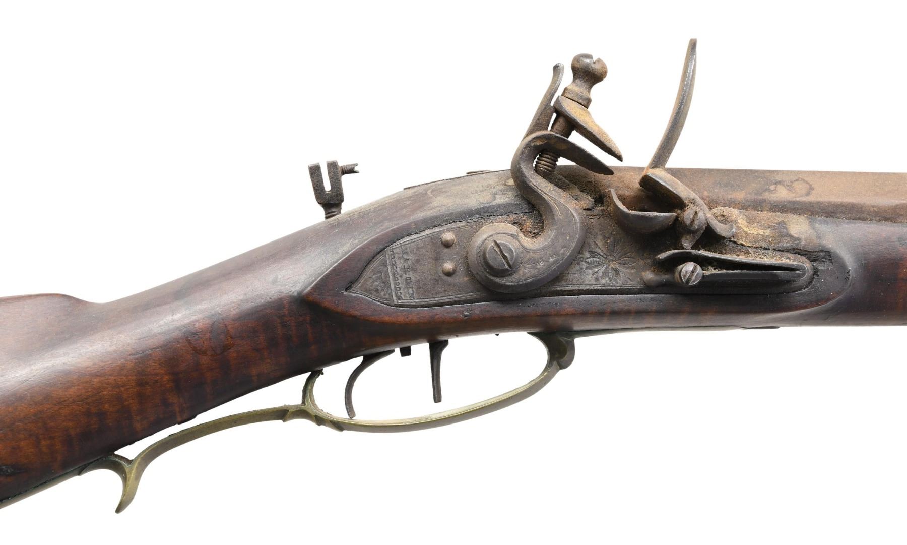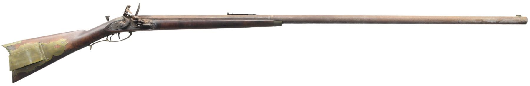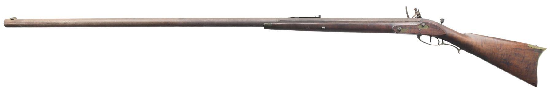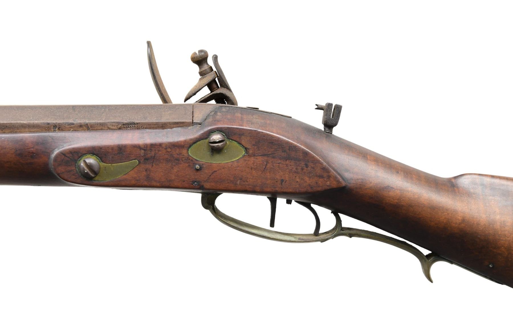 Cal. 62. NSN. Bbl. 47 1/4" octagon-to-round w/ faceted transition. Brass blade front sight. U notch strap metal rear sight w/ upright only for lollipop style tang sight. Engraved trade lock is marked "MARTIN". Double set triggers. Wedge fastened half-length curly maple stock. Brass fittings include crescent buttplate, pierced segmented rectangular lid horse-head patchbox, trigger guard, sideplate escutcheons & nosecap. WEIGHT: 12 lbs, 9.7 oz. CONDITION: metal exhibits a light red rust appearance. Stock shows light wear & marks. Patchbox lid is bent & will not latch. Sound lock. Dark lightly pitted bore retains strong rifling. (01-25425/DS). ANTIQUE. $400-600.