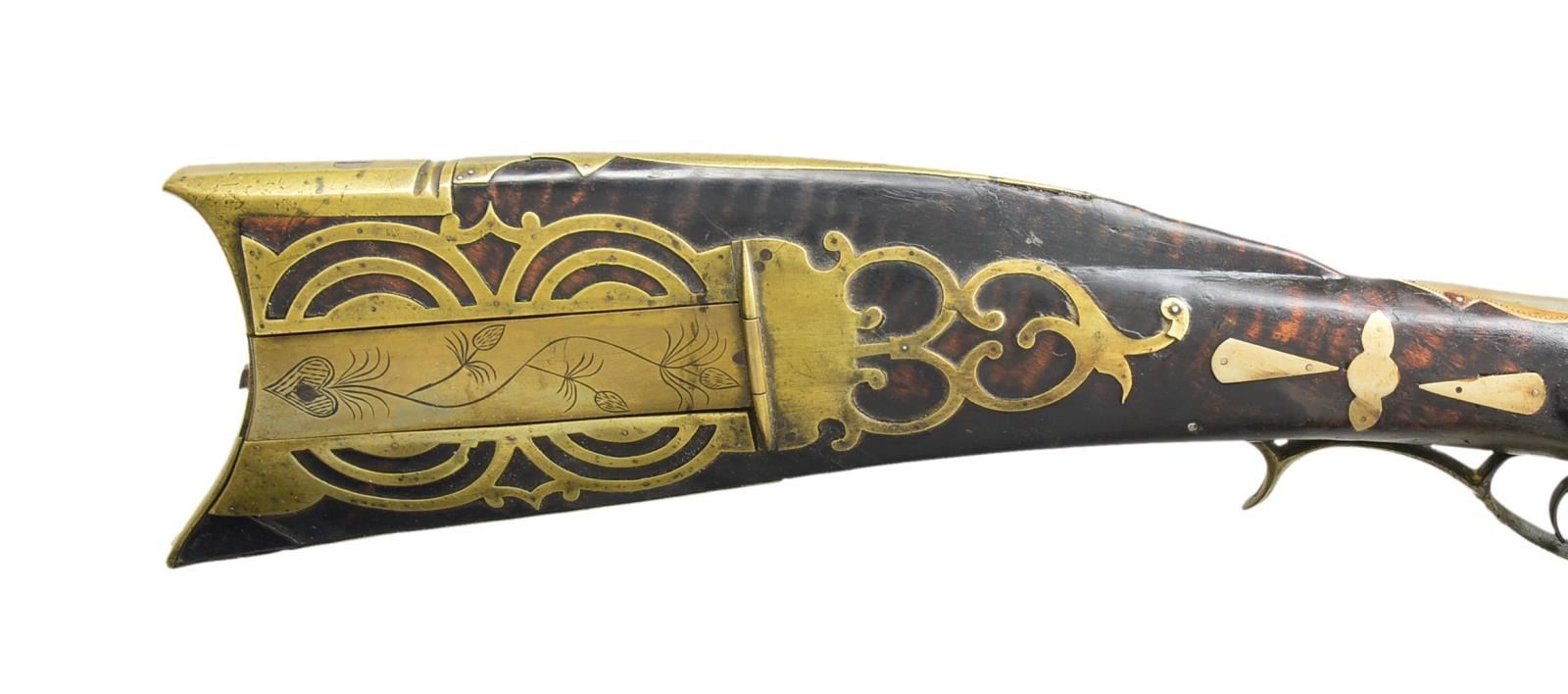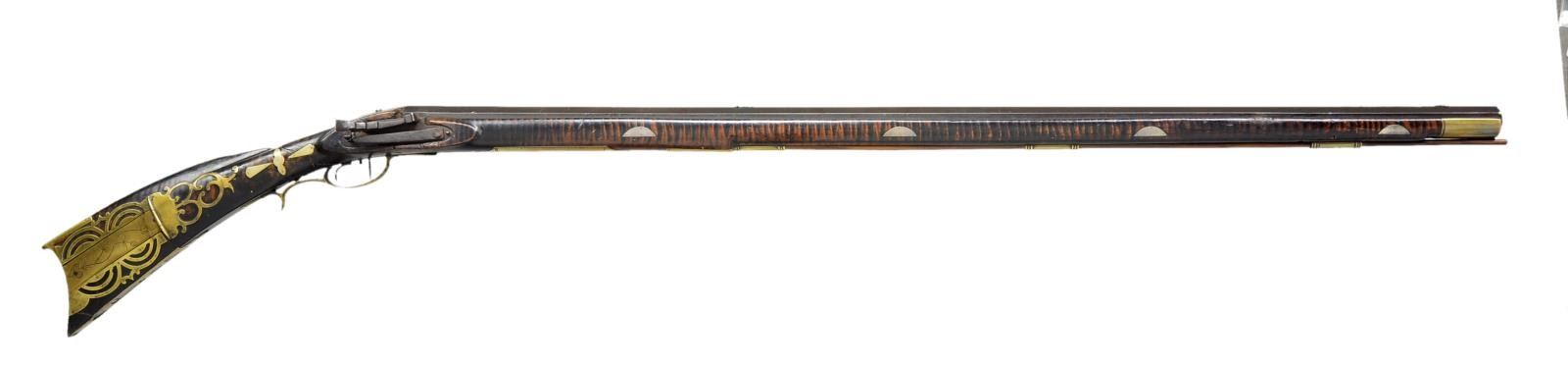 ATTRIBUTED TO SAMUEL MORRISON. Cal. 45 rifled bore. NSN. Bbl. 42" full oct., signed “SM”. Overall length 57". Has an elaborate brass patchbox w/ 13 piercings, 16 silver inlays along stock, brass toeplate w/ 4 piercings & 6" brass saddle plate. Has a very early hand forged mule ear side hammer lock, indicating extremely early mfg. likely meaning the gun was made in the 1820s. Original stock is nicely curled w/ some incised carving rear of cheekpiece. CONDITION: wood at the toe is, as usual, separated from shrinkage. Stock is broken & repaired through wrist area w/ touched up finish. Hammer mechanism is also broken, requiring repair. PROVENANCE: Collection of Dr. John Persing. (01-19553/RG). ANTIQUE. $1,200-1,800.