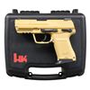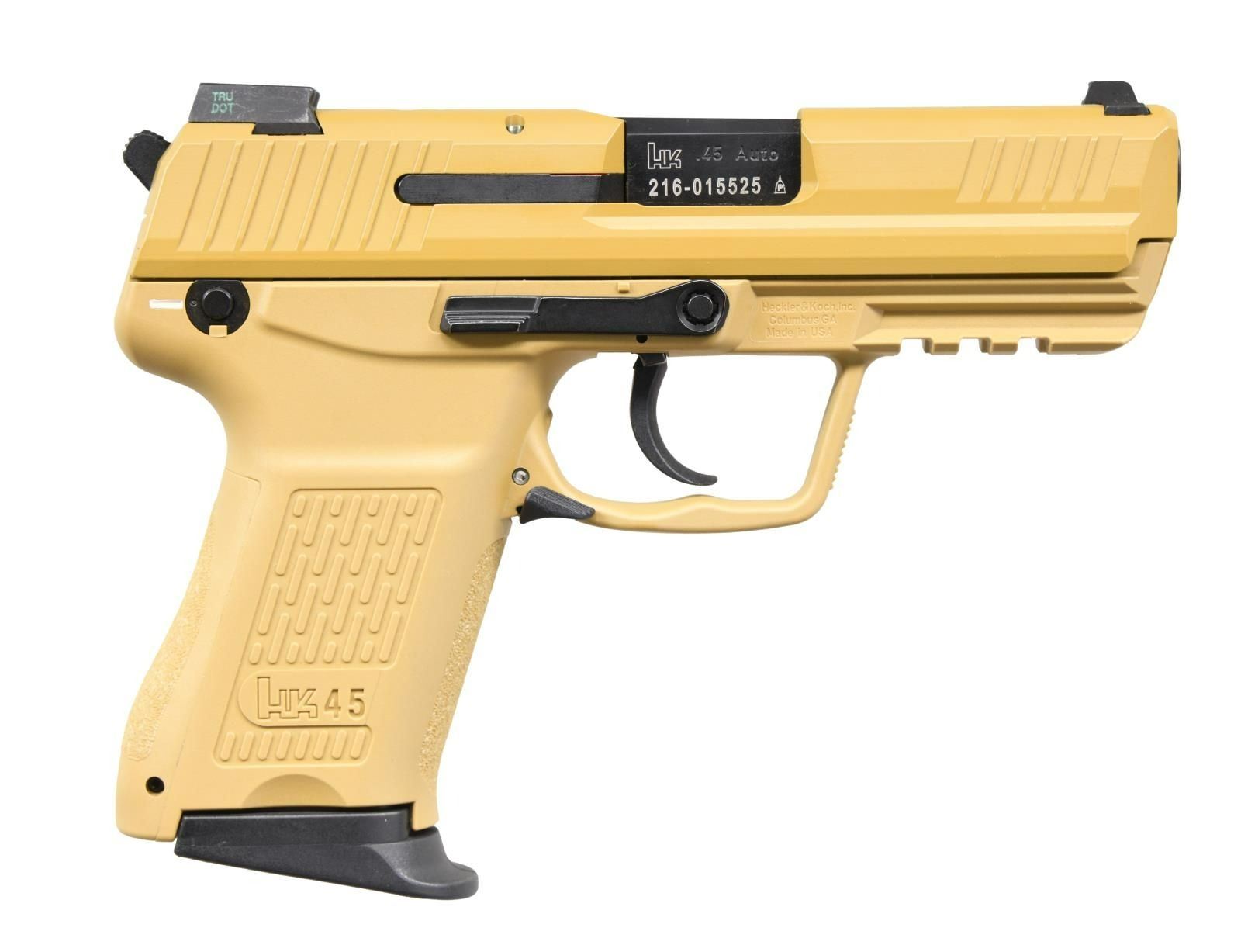 Cal. 45 ACP. S# 216-015525. Bbl. 3 3/4". Model 45C semi-automatic pistol manufactured by Heckler & Koch USA. Left side of slide exhibits the model and cal. designations above a "BF" and the S#. Tan slide and polymer frame, with matte black bbl. Dual purpose safety and decocker lever. All numbers are matching and are present on the frame, slide, and bbl. MAGS: 1-8 rd. UNATTACHED ACCESSORIES: w/ box. CONDITION: near new, with metal components retaining virtually all of their original factory finish overall. Mirror bore, exhibiting strong polygonal rifling throughout. Polymer frame is excellent. PROVENANCE: The Collection of Gun Sport Ltd owned by Jon R. Thomas. (23-4576/MLW). MODERN. $600-900.