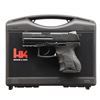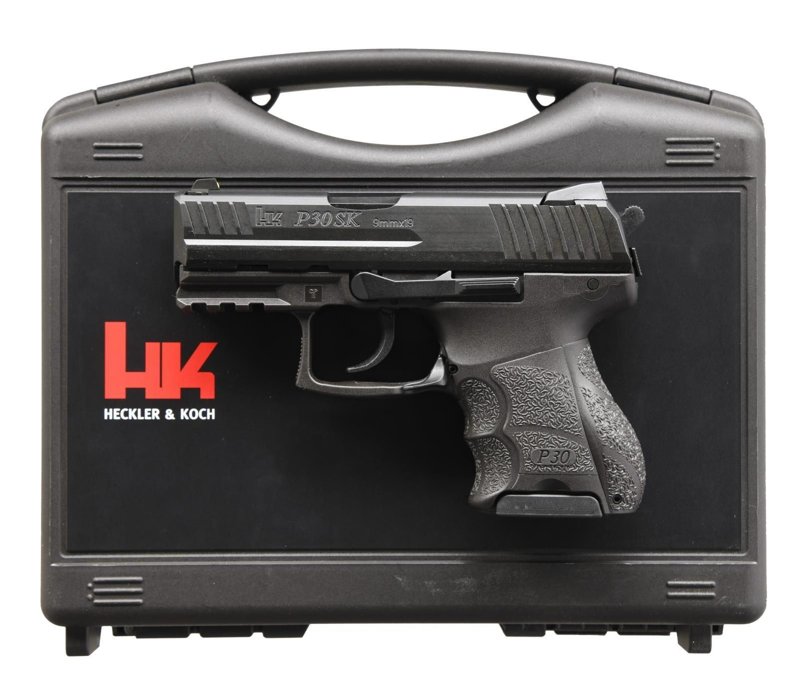 WITH MATCHING FACTORY HARD CASE. Cal. 9mmL. S# 214-002771. Bbl. 3 1/8". Model P30SK semi-automatic pistol mfg. by Heckler & Koch in Germany and imported by HKI of Columbus, GA. The left side of the slide exhibits the "HK" logo followed by the model and cal. designations, with the right side exhibiting the S#, German proofs, and an Ulm Proof House antler stamp. Right side of frame exhibits HK's mfg. information. Matte black slide and bbl., with textured black polymer frame. MAGS: 2-10rd. UNATTACHED ACCESSORIES: matching factory hard case containing 1 spare mag., mag. loader, and grip extensions. CONDITION: near new, with metal components retaining virtually all of their original factory finishes overall. Mirror bore, exhibiting strong polygonal rifling throughout. Frame is excellent. Case shows some light exterior wear. PROVENANCE: The Collection of Gun Sport Ltd owned by Jon R. Thomas. (23-3330/MLW). MODERN. $500-800.