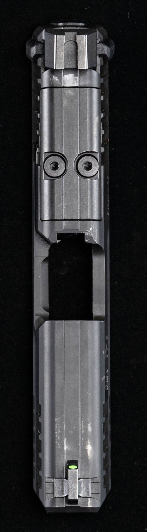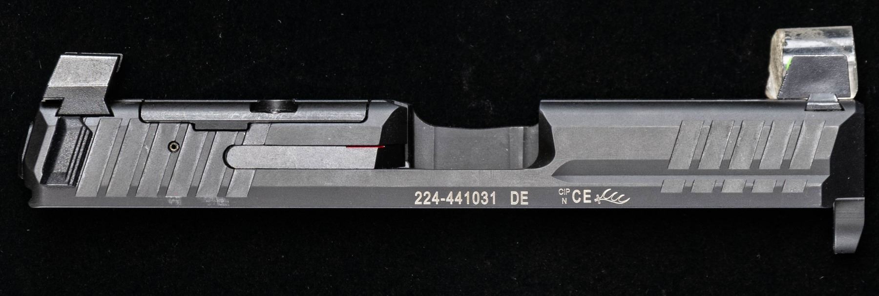 VP9 pistol slide mfg. in Germany by Heckler & Koch. Left side of the slide is marked with the HK logo, followed by the model and cal. designations, with the S#, "DE", followed by a triad of German proofs, including a "CE" (24) date code. Slide exhibits a dull black finish overall. Dovetailed high profile XS green fiber optic front and square notch rear silencer sights, with RMR plate. CONDITION: metal components retain the majority of their original factory matte black finish, exhibiting some scattered spots and patches of wear fading to gray patina, as well as some superficial handling marks overall. (02-25536/MLW). NON-GUN. $100-200.
