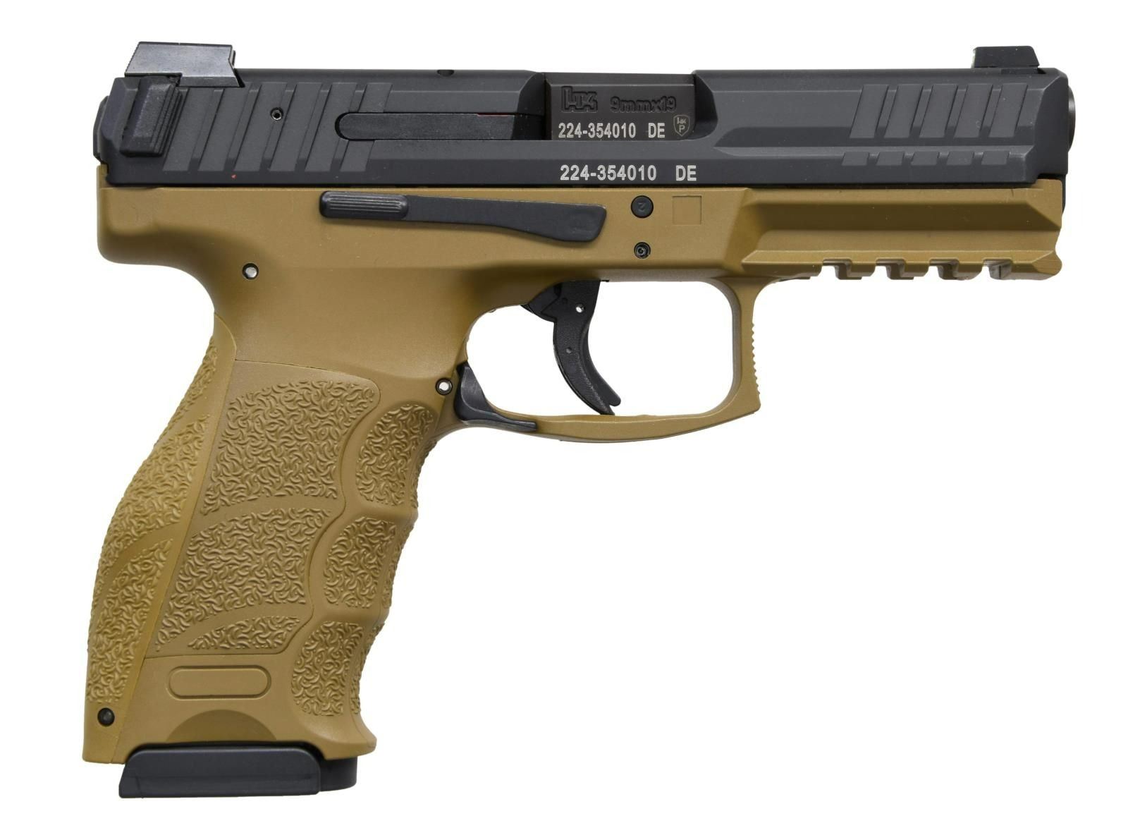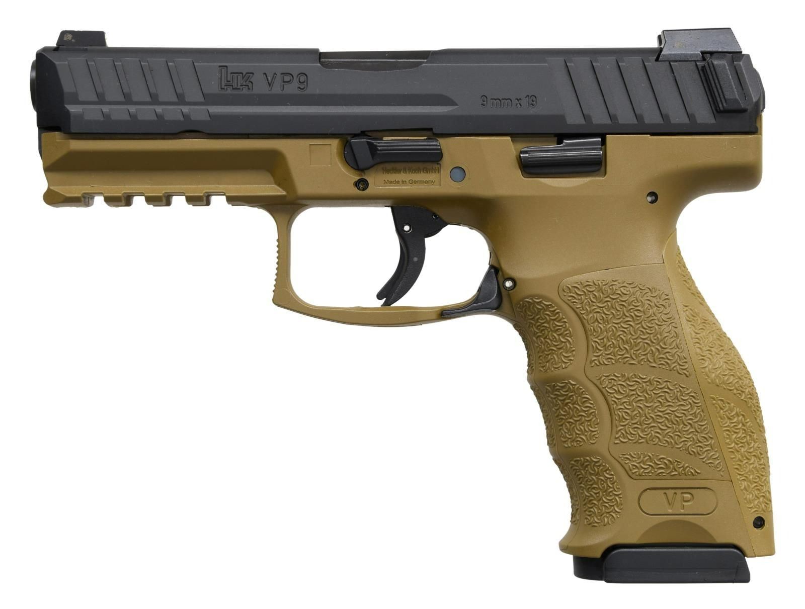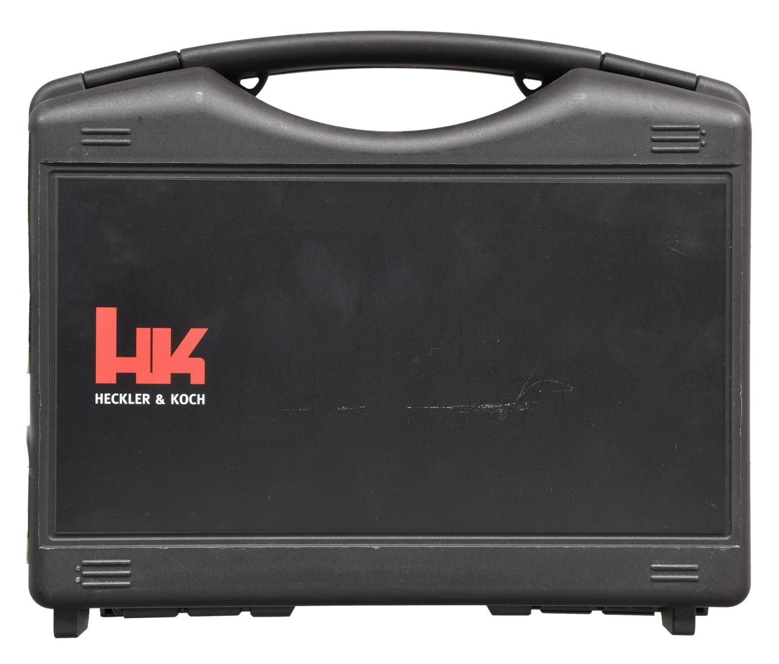 Cal. 9mm. S# 224-354010. Bbl. 4". VP9 semi-automatic pistol mfg. by Heckler & Koch in Germany and imported by HKI (Heckler & Koch USA) in Columbus, GA. Left side of slide is marked with the model and cal. designations. Matte black slide and bbl., with olive textured polymer frame. All numbers are matching and include the frame, slide, and bbl. MAGS: 1-17 rd. UNATTACHED ACCESSORIES: w/box. CONDITION: near new, with metal components retaining virtually all of their original factory finish overall. Mirror bore, exhibiting strong polygonal rifling throughout. Polymer frame is excellent. PROVENANCE: The Collection of Gun Sport Ltd owned by Jon R. Thomas. (23-4297/MLW). MODERN. $600-900.