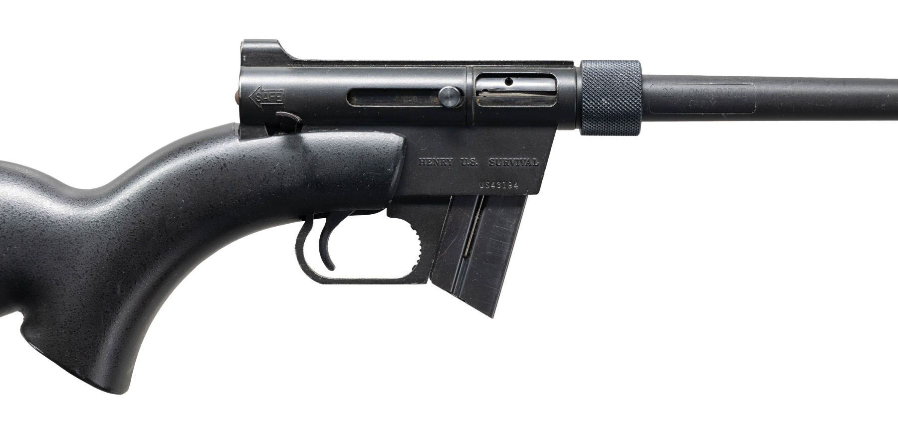 Cal. 22 LR. S# US43194. Bbl. 16". Blade front sight. Fixed aperture rear sight. Henry AR-7 US Survival Rifle. Matte black finish. Black polymer buttstock with Armalite AR-7 explorer markings. MAGS: 1-8 rd. CONDITION: stock shows some scratches & handling marks. Metal retains 85% matte black finish with scattered flaking, edge & handling wear. Action functions properly when hand cycled. Good bore with strong rifling. (25-3993/MJC). MODERN. $250-350.