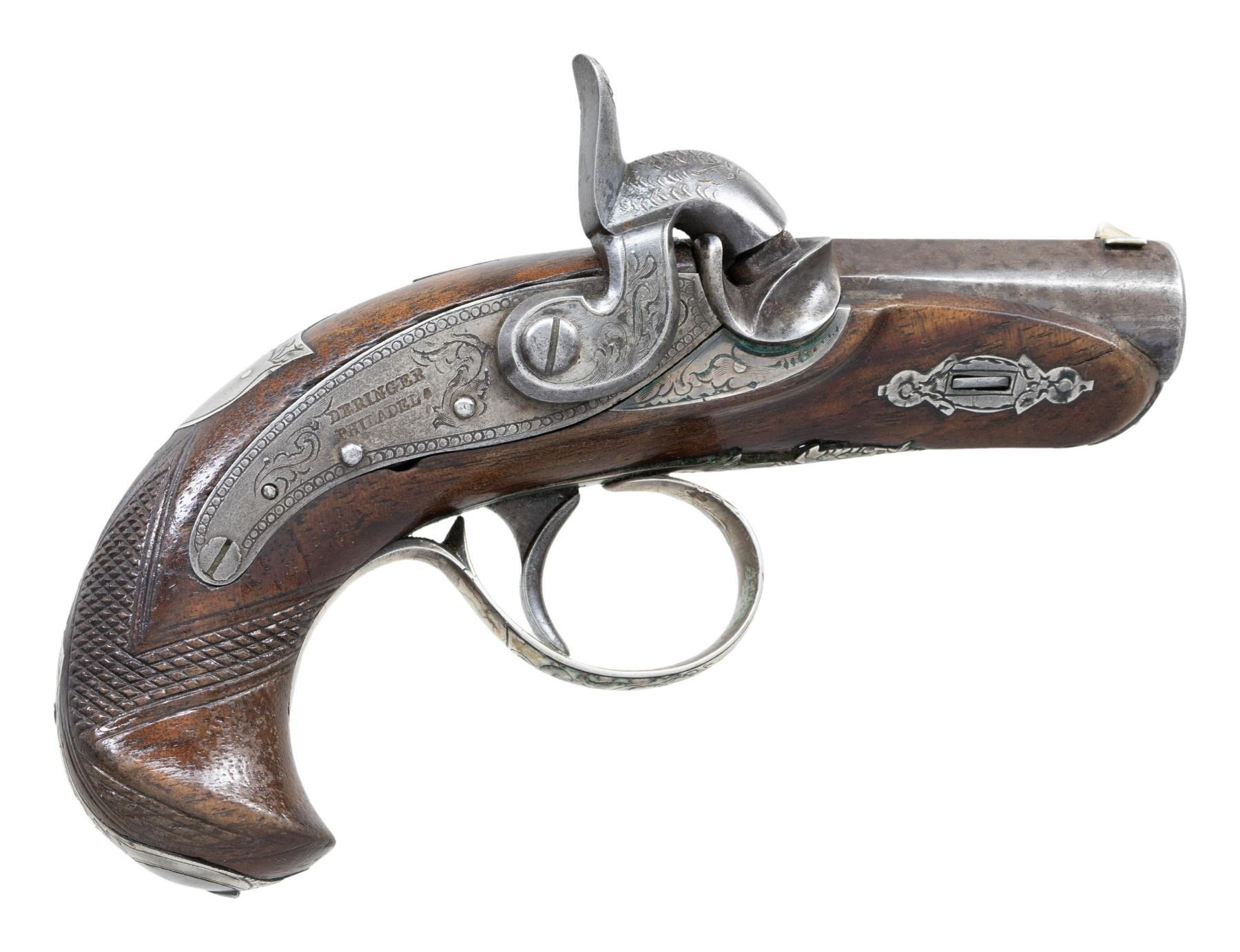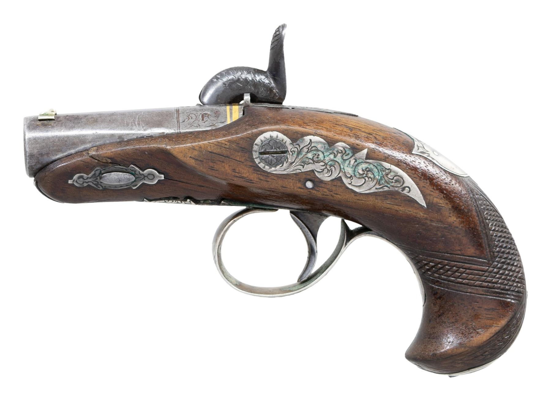 Cal. 41. NSN. Bbl. 2" semi octagon with flat top having double gold bands at breech. German silver front sight. Left flat is marked "P" Top flat & lock are marked "DERINGER / PHILADELa". Wedge fastened birds head walnut stock is checkered at the wrist. Engraved German silver fittings consist of trigger guard, side plate, wedge escutcheons, nosecap, shield escutcheon, and trapdoor butt cap. CONDITION: metal finish has faded to gray. Stock shows wear with small chips around the lock and a crack through the left side of the forearm. Sound lock. Dark lightly pitted bore retains largely intact rifling. (01-26646/DS). ANTIQUE. $1,400-2,000.