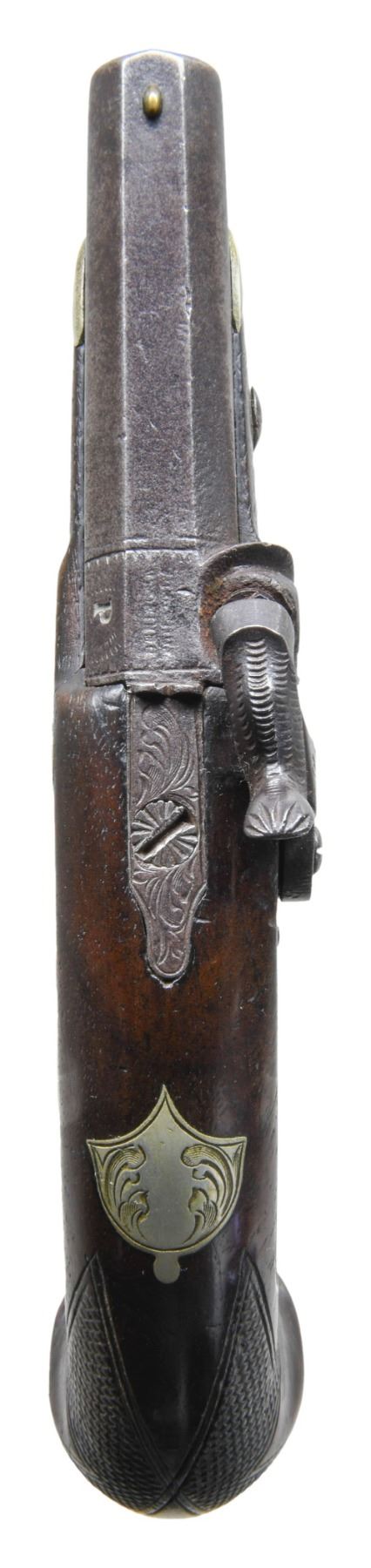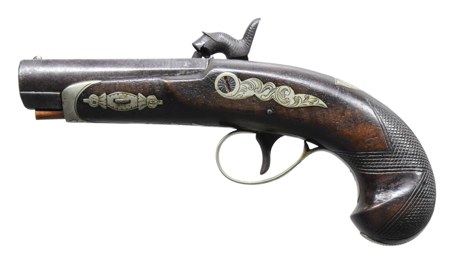 Cal. 41. NSN. 6.75"overall, 2.5" barrel, breech and back action lock stamped "DERINGER / PHILADEL'A", German silver mounted, checkered walnut stock. CONDITION: good to very good overall, iron patina, light pitting. PROVENANCE: The Esteemed Norm Greenberg Collection. (01-27610/JS). ANTIQUE. $800-1,200.