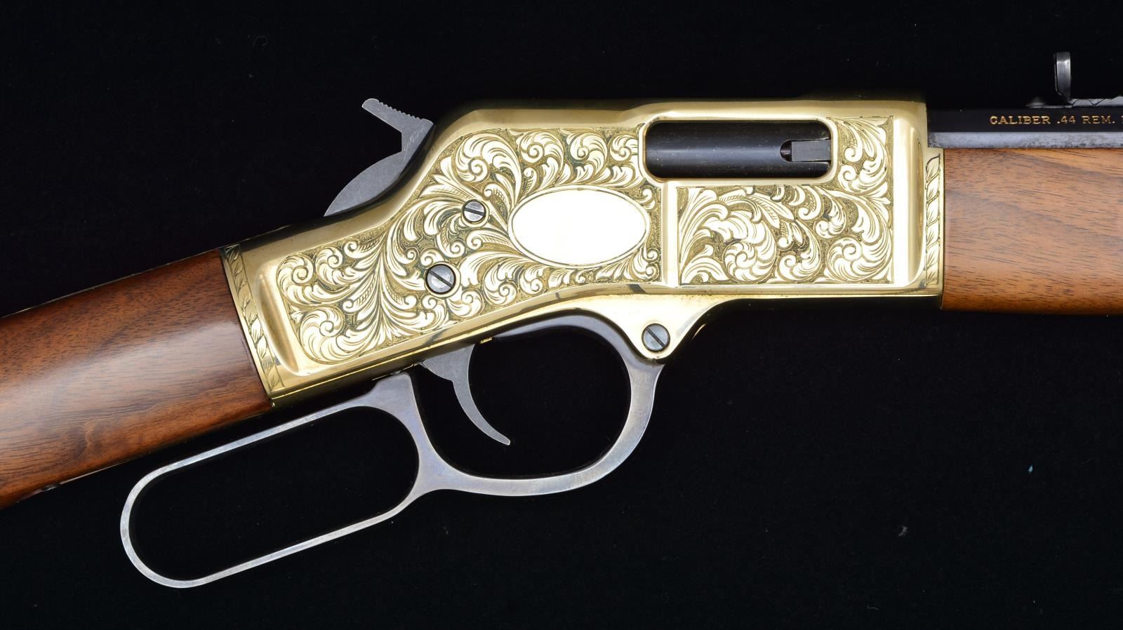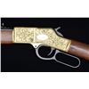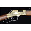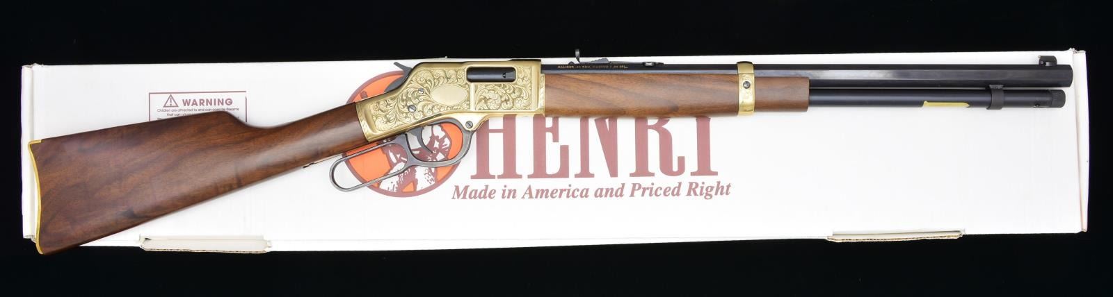 Cal. 44 Rem. Mag. / 44 Spl. S# BB00141D. This limited edition rifle has a brass action that is decorated w/ Nimschke style scroll floral engraving; extending to the bbl. band. In the center of the engraving has a oval inscription area for personalization. 20" Oct. bbl. has sporting sights w/ gold filled markings. Full length tubular mag. Figured American walnut stock set w/ brass carbine buttplate. UNATTACHED ACCESSORIES: Henry box w/ matching numbered label containing paperwork, receiver cover & hang tag. CONDITION: near excellent overall appearance & bore. (22-1420/MD). MODERN. $750-1,000.