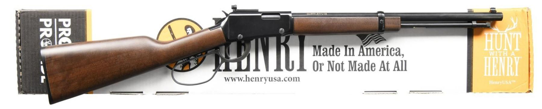 MATCHING FACTORY BOX. Cal. 22 S, L, LR. S# TLP09136. Bbl 17". Model H001TLP lever action rifle mfg. by Henry Repeating Arms Co. The left side of the bbl. is marked with Henry's mfg. information, with the cal. designation on the right. Lower receiver tang exhibits the model designation and S#. Receiver and barrel band exhibit a black anodized finish, with the bbl., mag. tube, lever, trigger, and hammer being blued. Plain smooth wood straight grip buttstock with plastic buttplate and smooth wood forend. Full length octagonal bbl. features a dovetailed brass beaded blade front sight, with the receiver being mounted with a Skinner aperture rear sight. UNATTACHED ACCESSORIES: matching factory box. CONDITION: near new with metal components retaining virtually all of their original factory finishes overall. Mirror bore, exhibiting well defined rifling throughout. Wood furniture is excellent. Box shows some mild exterior wear, but otherwise remains sturdy and serviceable. PROVENANCE: The Collection of Gun Sport Ltd owned by Jon R. Thomas. (23-3516/MLW). MODERN. $400-600.