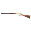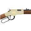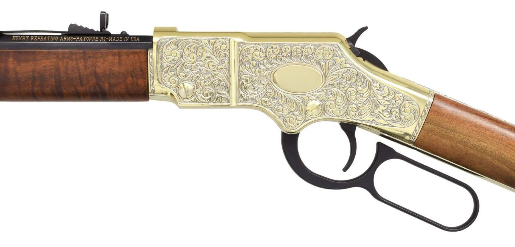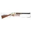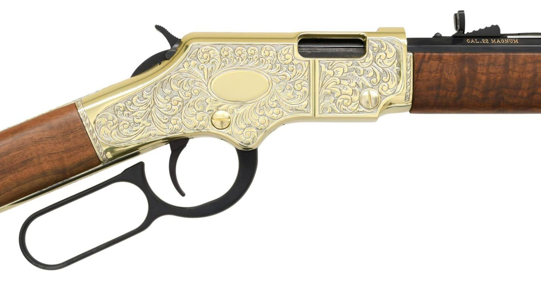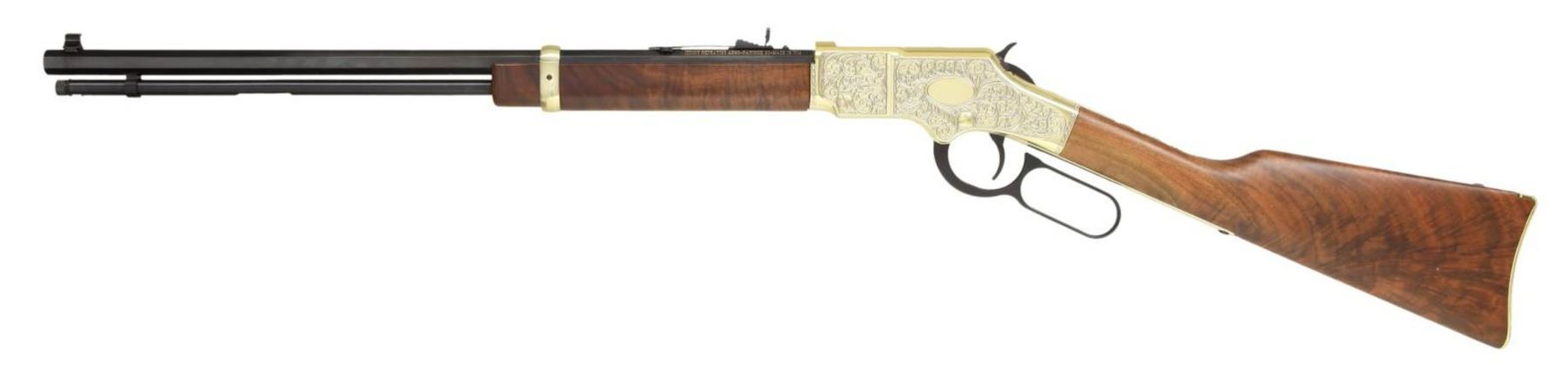 ACTION RIFLE WITH MATCHING FACTORY BOX. Cal. 22 WMR. S# GB0725MD. Bbl 20 1/2". Model H004MDD "Golden Boy Deluxe" lever action rifle mfg. by Henry Repeating Arms Co. The left side of the bbl. exhibits Henry's mfg. information, with the cal. designation on the right. Receiver features scroll engraving on a punch dot background on either side, with an additional panel over the top and on the upper receiver tang. Receiver, bbl. band, and buttplate exhibit a high polish brass finish. Blued bbl., mag. tube, lever, trigger, and hammer. Deluxe smooth wood straight grip buttstock and forend. Full length octagonal bbl., with dovetailed brass beaded blade front sight and dovetailed U-notch rear sight. UNATTACHED ACCESSORIES: matching factory box. CONDITION: near new, with metal components retaining virtually all of their original factory finishes overall. Mirror bore, exhibiting well defined rifling throughout. Wood furniture is excellent. Box exhibits moderate exterior wear and some tearing at corners. PROVENANCE: The Collection of Gun Sport Ltd owned by Jon R. Thomas. (23-3803/MLW). MODERN. $600-1,000.