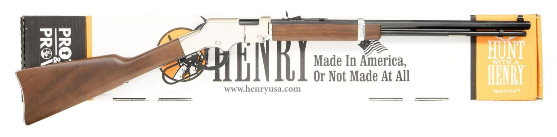 WITH MATCHING FACTORY BOX. Cal. 22 WMR. S# SB008914M. Bbl 20 1/2". Model H004SM "Silver Boy" lever action rifle mfg. by Henry Repeating Arms Co. The left side of the bbl. is marked with Henry's mfg. information, with the cal. designation on the right. The receiver, bbl. band, and buttplate exhibit a nickel plated finish, with the bbl., mag. tube, trigger, and hammer being blued. Lever is comprised of aluminum and exhibits a black anodized finish. Smooth plain straight grip buttstock and forend. Dovetailed blade front sight with dovetailed U-notch rear sight. UNATTACHED ACCESSORIES: matching factory box. CONDITION: near new, with metal components retaining virtually all of their original factory finishes overall. Mirror bore, exhibiting well defined rifling throughout. Wood furniture is excellent. Box shows some mild exterior wear, but otherwise remains sturdy and serviceable. PROVENANCE: The Collection of Gun Sport Ltd owned by Jon R. Thomas. (23-3196/MLW). MODERN. $400-600.