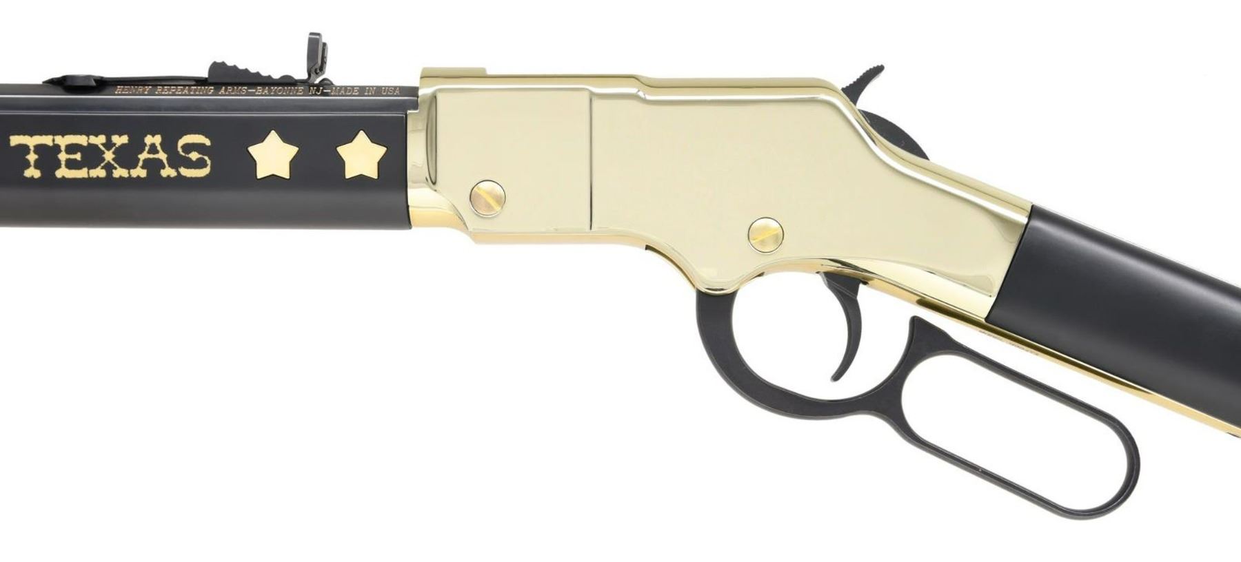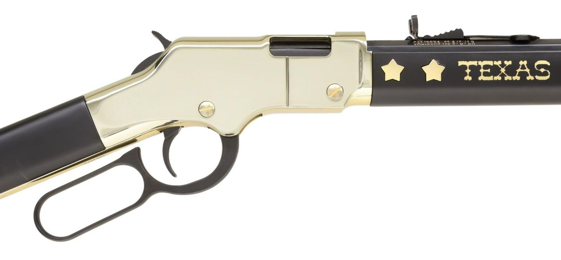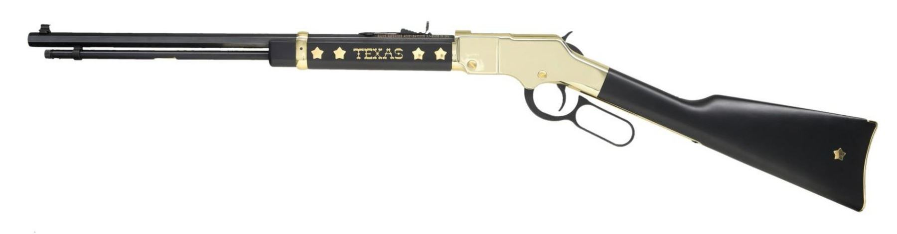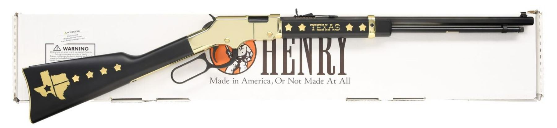 EDITION LEVER ACTION RIFLE WITH MATCHING FACTORY BOX. Cal. 22 S, L, LR. S# TX01079. Bbl 20". Model H004TX "Golden Boy" Texas Tribute Edition lever action rifle mfg. by Henry Repeating Arms Co. The left side of the bbl. is marked with Henry's mfg. information, with the right side exhibiting the cal. designation. Receiver, bbl. band, and lever exhibit a brass plated finish, with the bbl., mag. tube, lever, trigger, and hammer being blued. American walnut straight grip buttstock, marked with a gold state of Texas on the right, and smooth walnut forend marked "TEXAS" in gold characters on either side. Right side of buttstock is inlaid with 4 brass plated stars, with a single brass star on the left. Forend exhibits 2 stars on either side of "TEXAS" on both sides. Dovetailed brass beaded blade front sight, with dovetailed U-notch rear sight. UNATTACHED ACCESSORIES: matching factory box. CONDITION: near new, with metal components retaining virtually all of their original factory finishes overall. Mirror bore, exhibiting well defined rifling throughout. Walnut furniture is excellent. Box shows some mild exterior wear, with tearing at corners, but otherwise remains sturdy and serviceable. PROVENANCE: The Collection of Gun Sport Ltd owned by Jon R. Thomas. (23-3617/MLW). MODERN. $700-1,100.