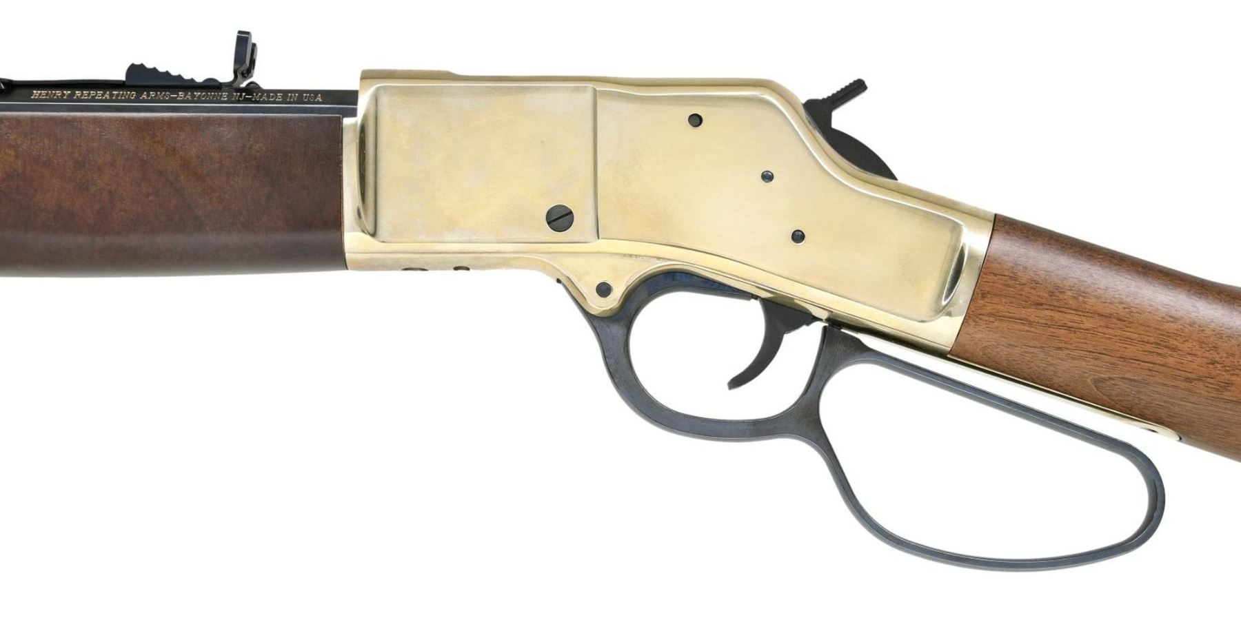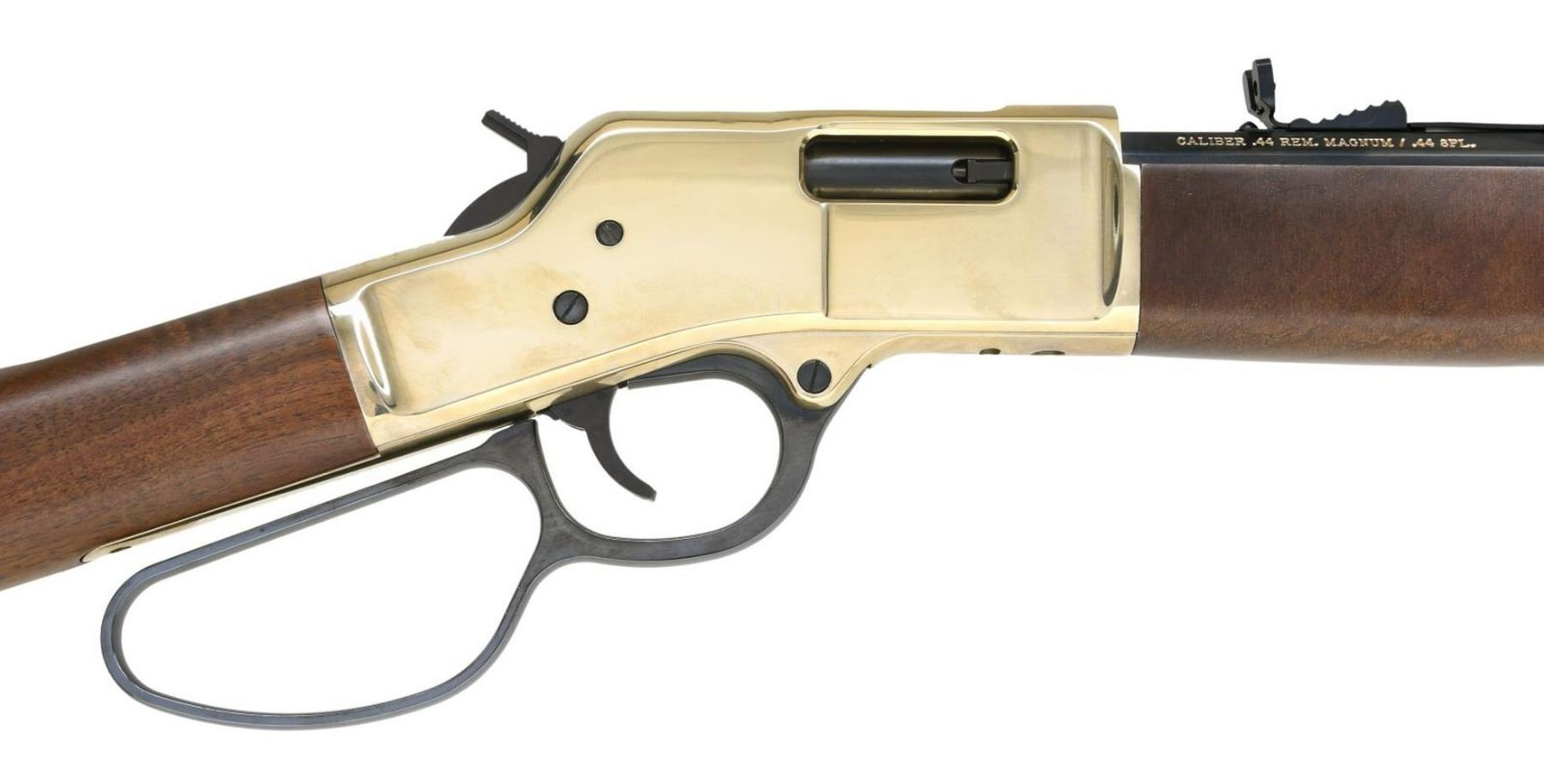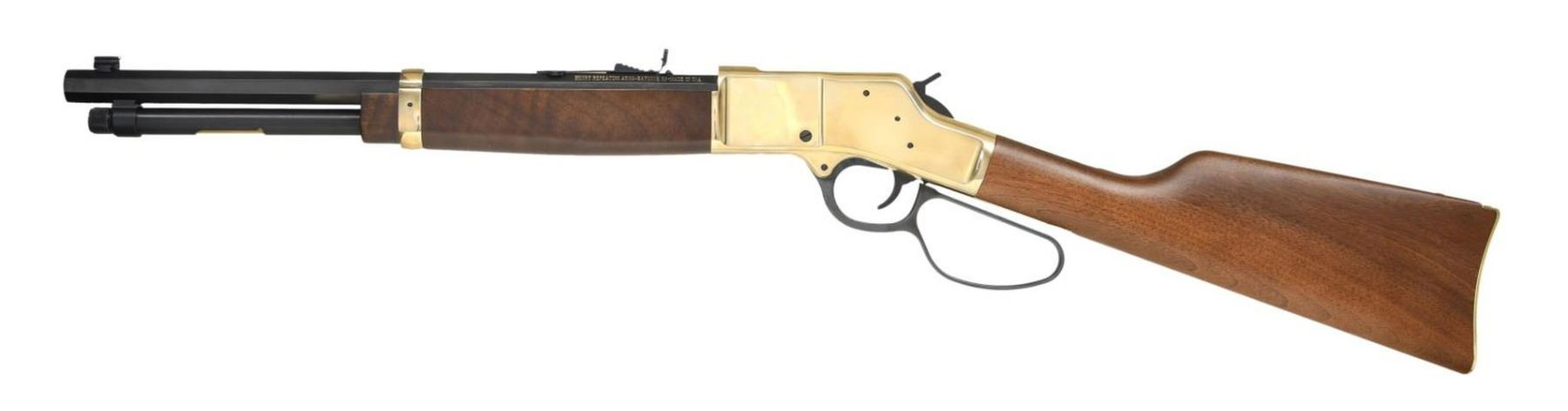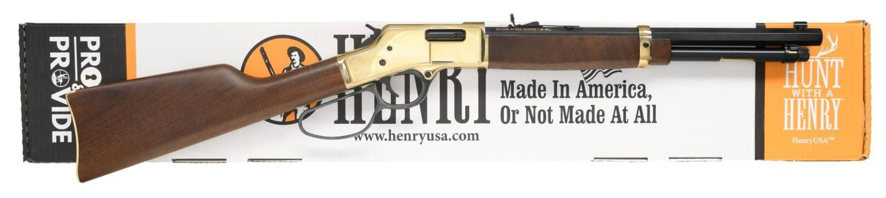 WITH MATCHING FACTORY BOX. Cal. 44 Rem Mag / 44 Spl. S# BBR011173. Bbl 16 1/2". Model H006R "Big Boy Carbine" mfg. by Henry Repeating Arms Co. The left side of the bbl. exhibits Henry's mfg. information, with the cal. designation on the right. Top receiver tang is marked with the model designation and S#. Brass receiver, buttplate, and bbl. band, with blued bbl. mag. tube, lever, trigger, and hammer. Heavy octagonal barrel with dovetailed brass beaded blade front sight and dovetailed U-notch rear sight. Smooth plain wood straight grip buttstock with smooth forend. UNATTACHED ACCESSORIES: matching factory box. CONDITION: near new, with metal components retaining virtually all of their original factory finishes overall. Mirror bore, exhibiting well defined rifling throughout. Wood furniture is excellent. Box shows some mild exterior wear from storage and handling, but otherwise remains sturdy and serviceable. PROVENANCE: The Collection of Gun Sport Ltd owned by Jon R. Thomas. (23-3225/MLW). MODERN. $500-800.