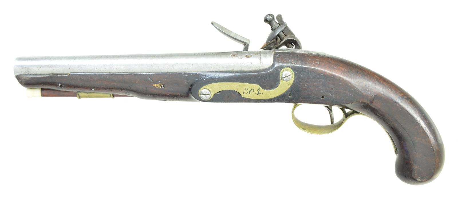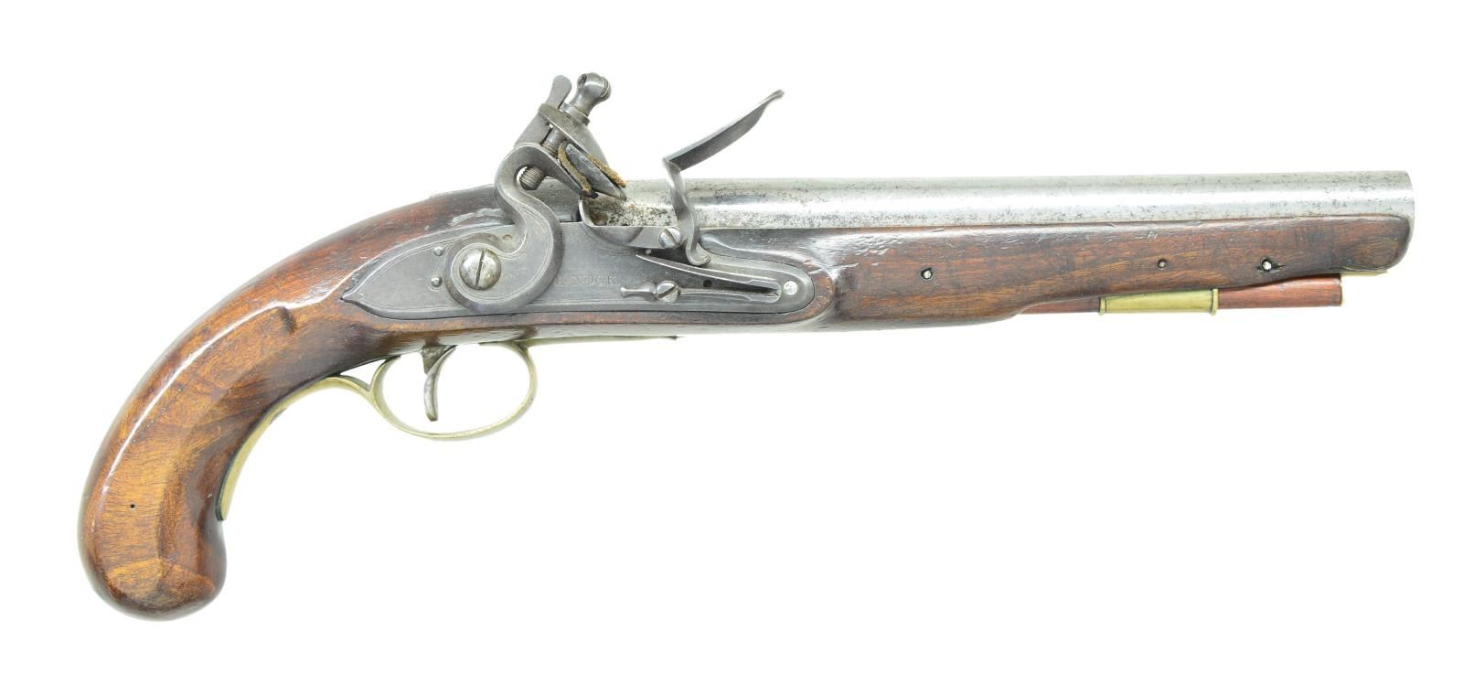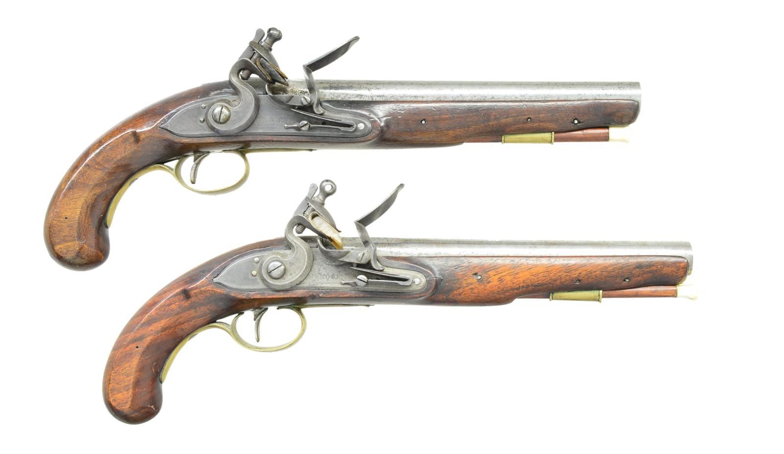 Cal. 62. NSN. Bbls. 9” round w/ smoothbores & faceted transitions at tangs. Breech ends are marked “LONDON” w/ London black powder proofs & view marks. Locks are marked “H. NOCK”. Locks & hammers have borderline engraving. Pin fastened round butt walnut stocks. Brass fittings include trigger guards, side plates & faceted pipes. Side plates are numbered “304”. Bone tipped hardwood ramrods. Henry Nock, 1741-1804, gunsmith, was a major supplier to the British military during the Napoleonic War period. CONDITION: both pistols are very good. Bbls. have cleaned appearance showing scattered very light pitting. Locks have a good dark faded appearance w/ clear markings. Brass shows evidence of cleaning. Stocks have worn finish & some aged darkening. One is missing a chip above the lock w/ cracks in lock & side plate areas. Functioning locks. Good bores show some very light pitting. (01-23054/DS). ANTIQUE. $2,500-4,000.