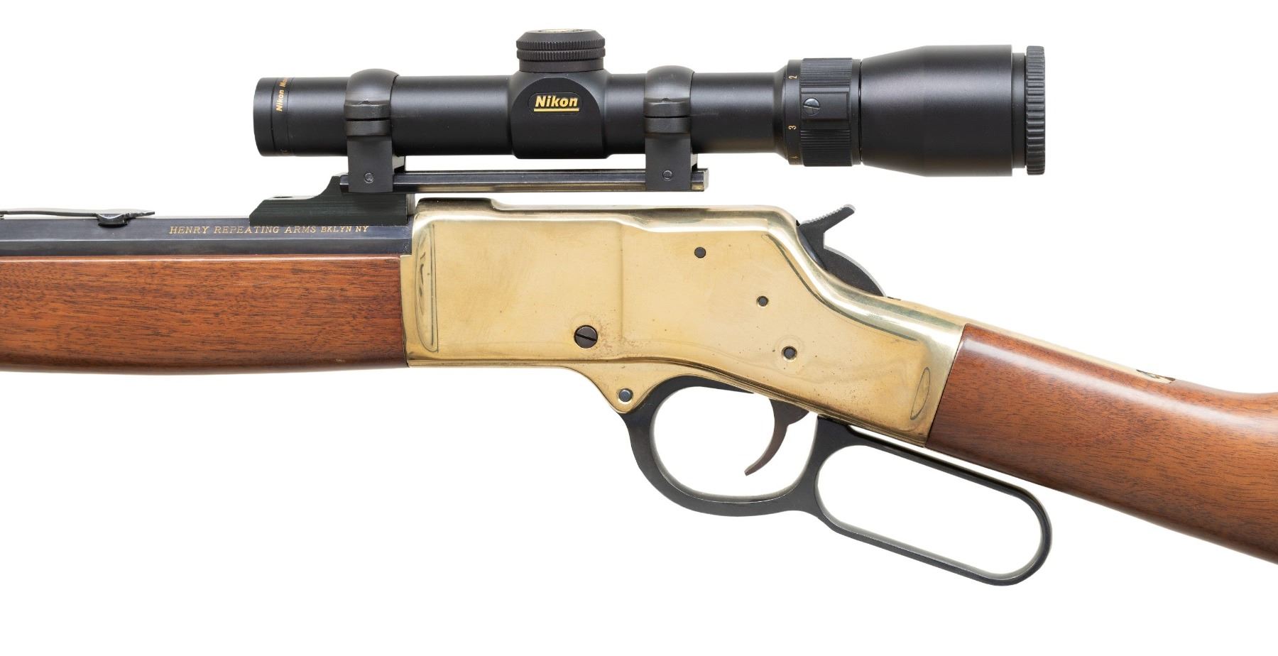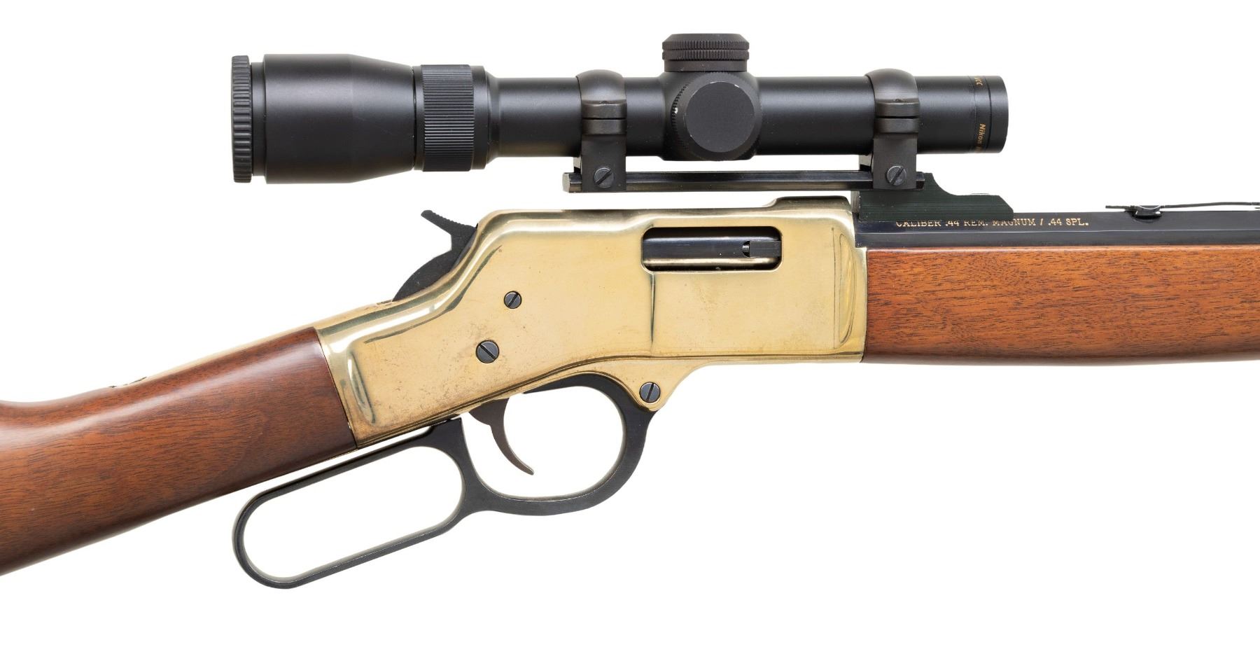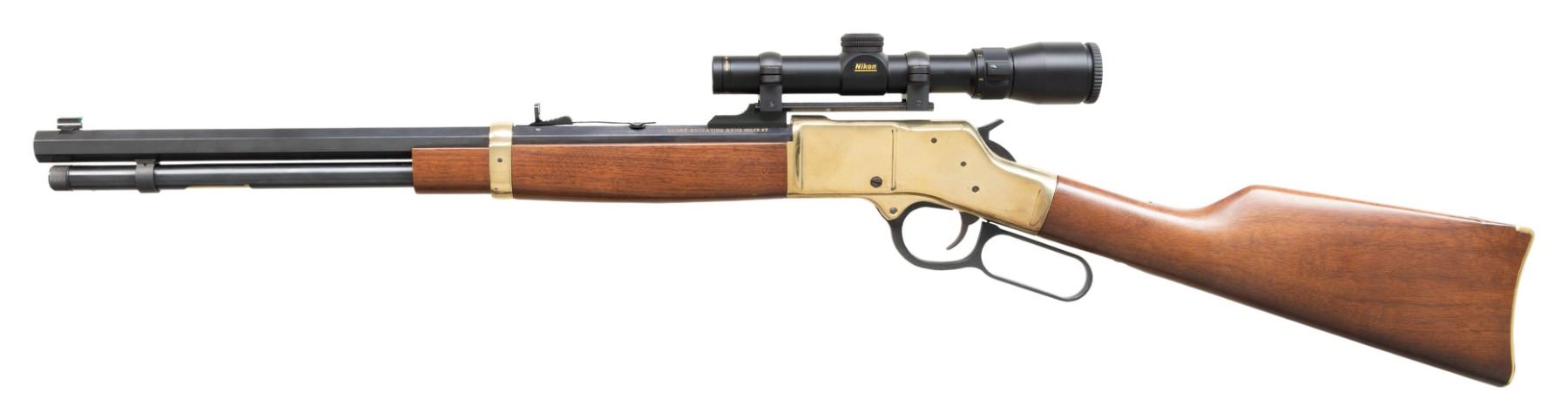 Cal. 44 Mag. / Spl. (44 Magnum / 44 Special). S# BB06468. Bbl. 19 7/8". "Big Boy" lever action rifle mfg. by Henry Repeating Arms in Brooklyn, NY. Left quarter flat of the octagonal bbl. is marked "HENRY REPEATING ARMS BKLYN NY", with the cal. designation marked on the right quarter flat. Upper receiver tang is marked with the S# "BB06468". Brass frame, bbl. band, and buttplate exhibit a polished finish, with remaining metal components exhibiting a polished blue finish overall. 1-piece plain wood forearm and straight grip buttstock. Dovetailed brass beaded blade front sight and dovetailed reverse mounted (for scope mount) U-notch rear sight. Top of bbl. has been drilled and tapped towards the breech, featuring a black anodized alloy scope rail, fitted with a Nikon 1.5-4.5x20mm scope. Trigger guard plate screw is absent. CONDITION: brass furniture retains a bright polished appearance, exhibiting some scattered superficial handling marks overall (most notably on the right rear section of the receiver), with some scattered pinprick spots of apparent verdigris. Blued parts are very good to excellent overall. Mirror bore, exhibiting well defined rifling throughout. Proper manual mechanics. Wood furniture shows a few small scattered superficial marks from handling and storage, but otherwise remains very good overall. Scope retains a clear and sharp optic. PROVENANCE: From the Buckstix Collection. (25-6437/MLW). CURIO. $500-800.