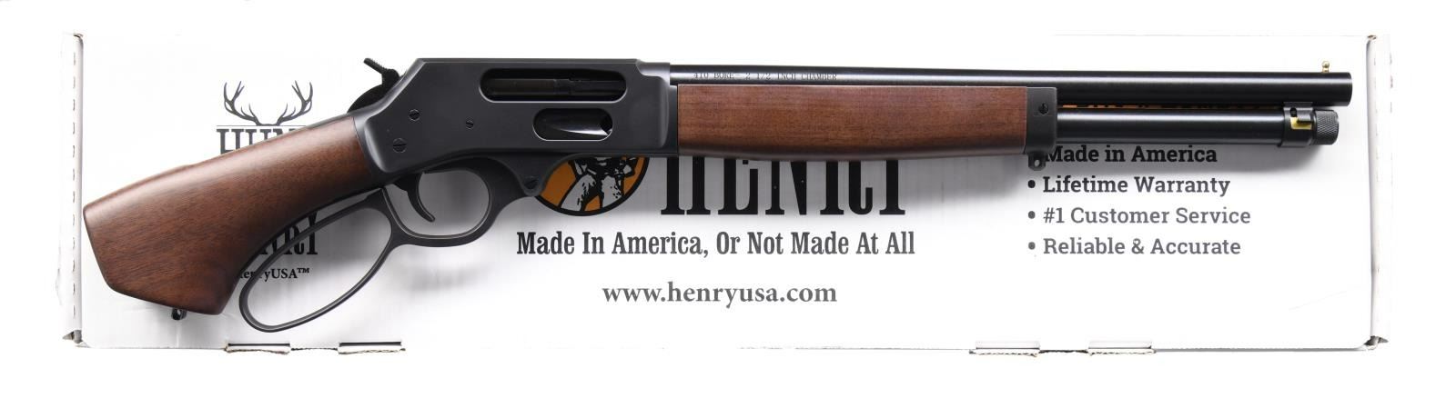 LEVER ACTION FIREARM WITH MATCHING FACTORY BOX. Cal. 410 GA, 2 1/2". S# AHFTL08964. Bbl. 15 1/8". Model H018AH-414 "Axe .410" lever action firearm mfg. by Henry Repeating Arms. Left side of the rnd. bbl is marked with Henry's mfg. information, with the cal. designation marked on the right. Upper receiver tang is marked with the model designation above the S#. Receiver and lever exhibit a matte black finish, with the bbl. and mag. tube exhibiting a blue finish. Smooth wood "axe" handle grip with smooth wood forend. Brass bead front sight. Muzzle features an internally threaded invector-style full choke. This item is simply classified as a "Firearm", necessitating only an ATF Form 4473 to purchase. Purchasers must be 21 years of age. It is important to note that while it is perfectly legal under federal law, some states do not allow ownership, such as MA and MD, and other states may require additional paperwork or alterations in order to remain compliant. UNATTACHED ACCESSORIES: matching factory box. CONDITION: near new, with metal components retaining virtually all of their original factory finishes overall. Mirror bore. Wood furniture is excellent overall. Box shows some exterior wear but otherwise remains sturdy and serviceable. (23-6385/MLW). MODERN. $400-600.