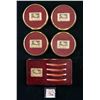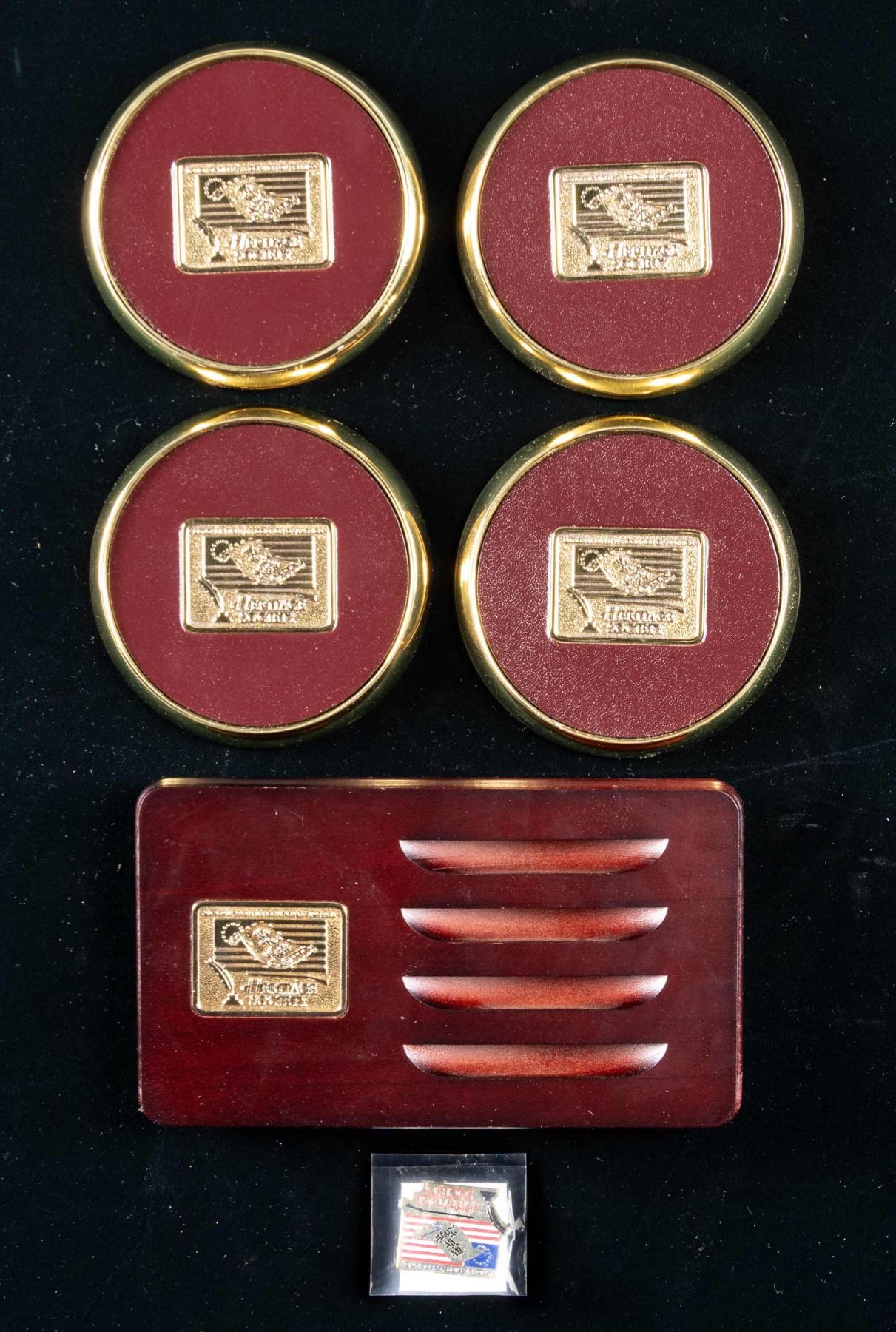 4 Wooden coasters with Heritage Society logo w/ cork bottoms & gold painted metal sides. Comes with 4 coaster stand, pin & box. CONDITION: near excellent.