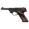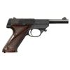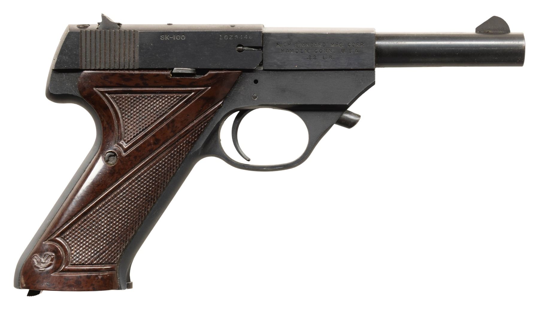 Cal. 22 LR. S# 1029446. Serrated blade front sight with added white paint. Drift-adjustable square notch rear sight. SK-100 Sport King Lightweight pistol made in Hamden, CT in 1960's. Blued finish. Checkered brown grips with right-handed thumb rest and Hi Standard logo. MAGS: 1-10 rd. CONDITION: grips show some checkering wear & handling marks. Metal retains 85% original blue with light oxidation throughout slide, some further scattered light oxidation, handling marks & light edge wear. Action functions properly when hand cycled. Bright near excellent bore. (25-6546/MJC). CURIO. $300-500.