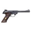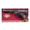 PISTOL. Cal. 22 LR. S# 1404158. Bbl. 6 3/4". Blade front sight. Adjustable square-notch rear sight. Mfg. 1964. Blued finish. Checkered brown grips with gold Hi-Standard medallions. MAGS: one 10-rd. UNATTACHED ACCESSORIES: matching-numbered factory box, in fair condition, with manual. CONDITION: grips show light handling wear. Metal retains 95% original blue, with a couple light scratches, scattered light edge, and handling wear. Action functions properly when hand-cycled. Very good bore. PROVENANCE: from the lifelong collection of Bill Peterken. (24-6118/MJC). CURIO. $300-500.