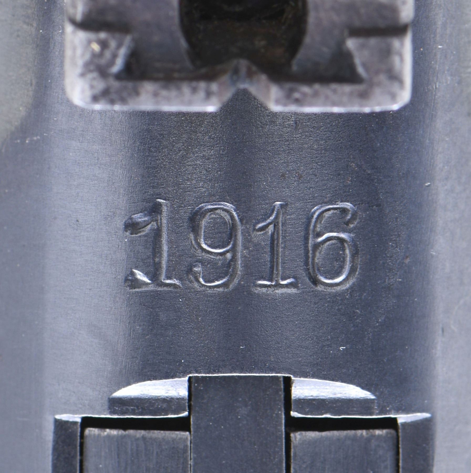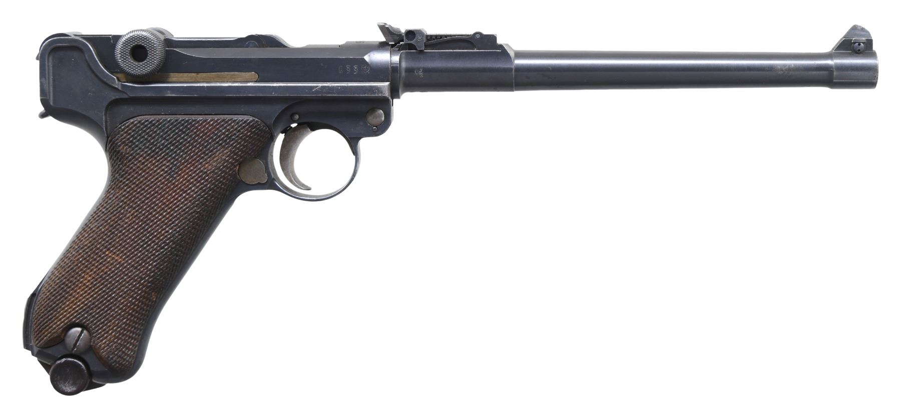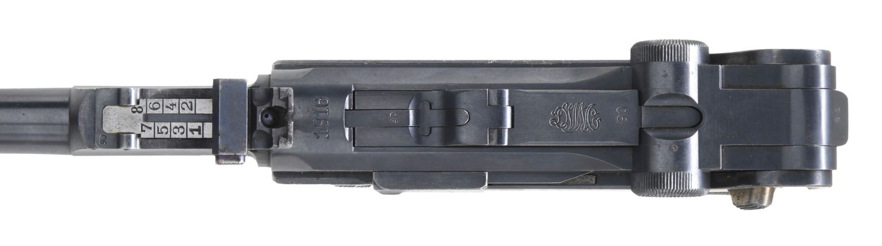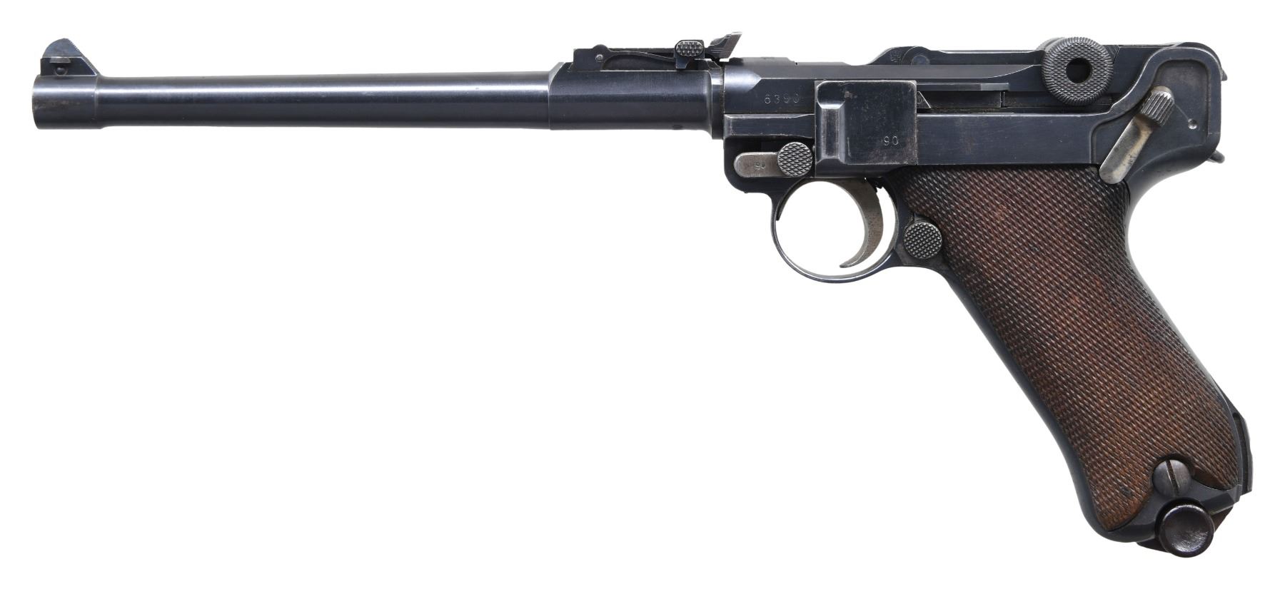 LP.08 SEMI-AUTOMATIC PISTOL, WITH DESIRABLE FINE TUNE FRONT SIGHT. Cal. 9mm Luger. S# 6390. Bbl. 7 7/8". LP.08 semi-automatic pistol mfg. by DWM under contract for the Imperial German military in 1916. The bbl. extension is marked "1916" over the chamber, with DWM arsenal proofs marked on the right. Right side of the bbl. extension, bbl., and left side of the breechblock exhibit a German reichsadler proof. Toggle is marked with the intertwined "DWM" monogram logo. Metal components exhibit a rust blue finish overall, with some small parts including the takedown lever, trigger, mag. release button, safety lever, and ejector exhibiting a straw finish. Frame is mounted with 2-piece checkered wood grips. Fine tune blade front sight, with tangent V-notch rear sight, graduated 1-8. All serialized parts are matching and include the frame, takedown lever, sideplate, trigger, safety lever & bar, hold-open latch, bbl., front sight, rear sight assembly, bbl. extension, trigger bar, breechblock, extractor, firing pin, toggles, as well as the grips. MAGS: 1 non-matching 8-rd. CONDITION: very good to excellent, with metal components retaining bountiful amounts of their original arsenal rust blue finish, exhibiting some spots of light to mild wear an thinning that show through to gray patina, as well as scattered spots of light to mild surface oxidation overall. Sideplate exhibits moderate oxidation and pitting in the bottom right corner. Strawed parts are good, exhibiting varying degrees of wear and spots of age related discoloration. Brilliant mirror bore, exhibiting a concentrated area of mild to moderate pitting on the right side towards the muzzle, while retaining well defined rifling throughout. Grips show some smoothing, as well as a few marks from handling and storage, but otherwise remains sturdy and serviceable. An attractive high condition example of a 1916 production DWM LP.08 pistol, with its original fine tuned sights. PROVENANCE: the Estate Collection of Charles Wagner. (25-289/MLW). CURIO. $2,000-3,000.