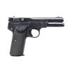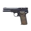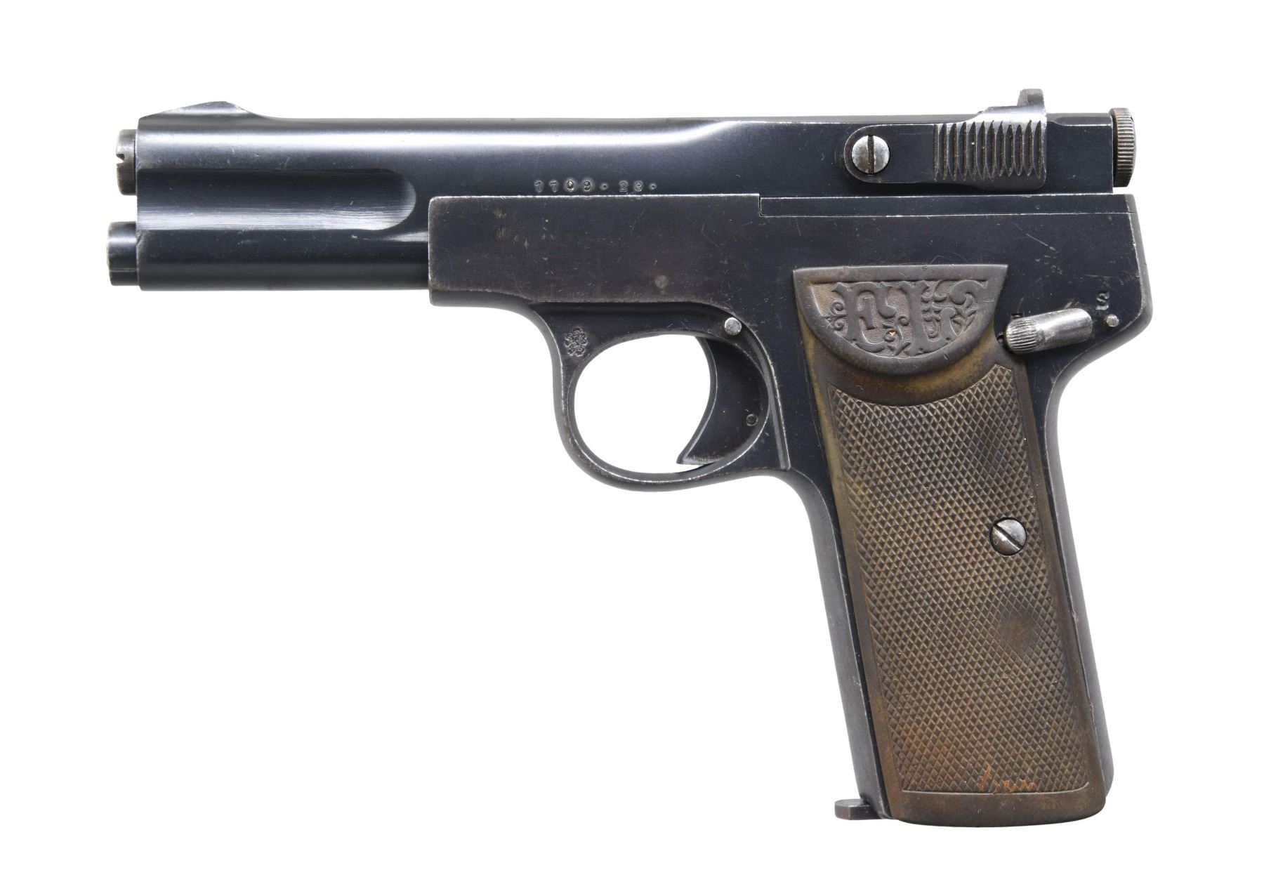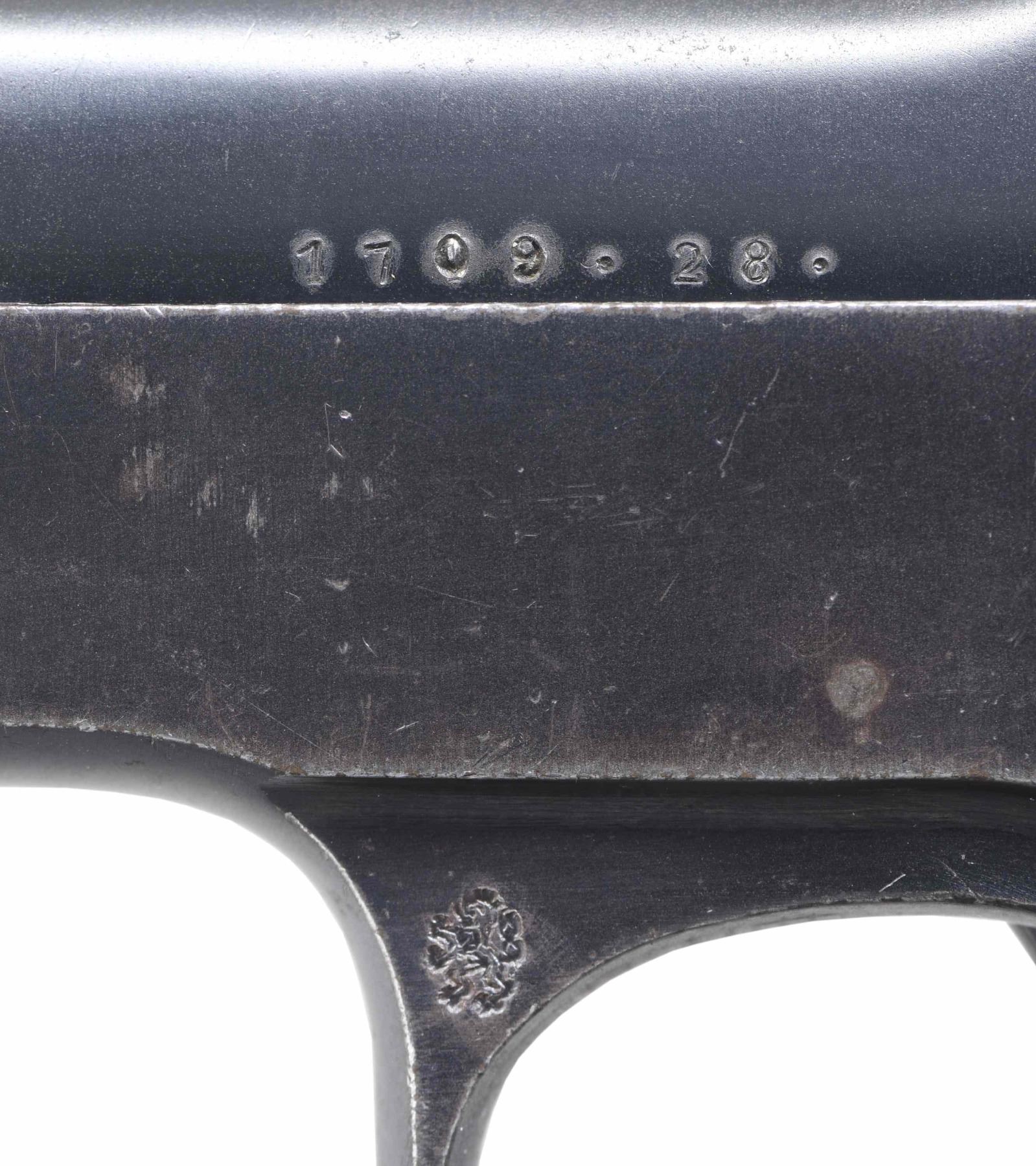 SEMI-AUTOMATIC PISTOL. Cal. 7.65mm. S# 74468. Bbl. 4 1/8". 5th Variation Model I semi-automatic pistol mfg. in Germany by Friedrich Langenhan. Right side of the breechblock is marked "F.L. SELBSTLADER/ D.R.G.M. 2526", with the digits on either side of "2526" having been overstamped. The left side of the frame is stamped with a Bulgarian Rampant Lion proof on the upper trigger guard web, with "1709.28." stamped on the left side of the slide. Right side of the frame, breechblock, slide, and bbl. exhibit a German Crown/N commercial nitro proof. Metal components exhibit a blue finish overall. Frame is mounted with 2-piece "FL" checkered brown hard rubber grips. Integral blade front sight with V-notch rear sight. All numbers are matching to the frame via the last three digits of the S# (468) and include the frame, slide, and breechblock. MAGS: One 7-rd. CONDITION: Metal components retain bountiful amounts of their original factory blue finish, exhibiting some spots of light to mild wear and thinning, with scattered spots of light-to-surface oxidation and pitting scattered overall. Left side of the frame exhibits mild degrees of pitting beneath the grip panel. Bright bore, exhibiting scattered spots of pitting, while retaining strong rifling throughout. Grips exhibit some smoothing and scattered marks from handling and storage overall, but otherwise remain sturdy and serviceable. Left grip panel shows age-related discoloration. A very nice example of a Bulgarian-proofed Langenhan Model I pistol. (24-6815/MLW). CURIO. $400-800.