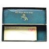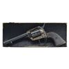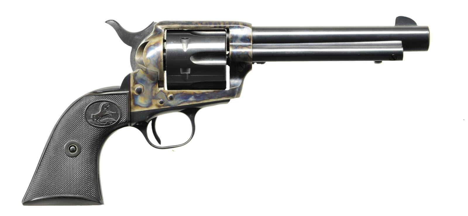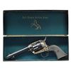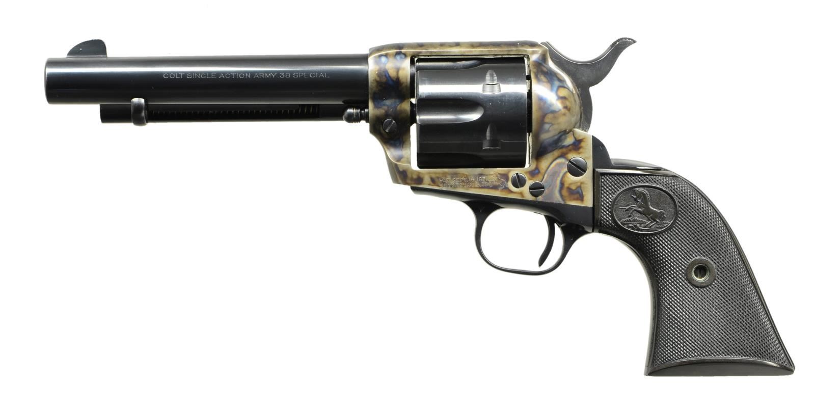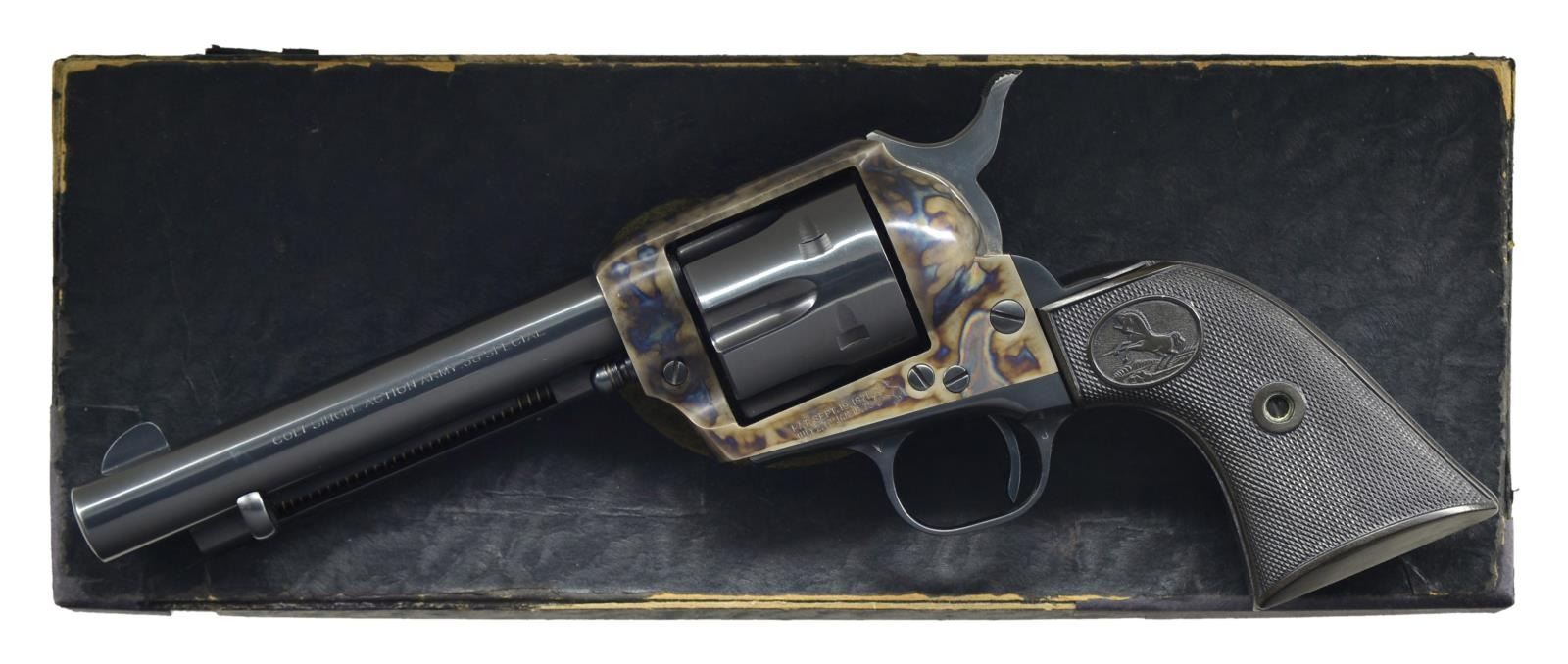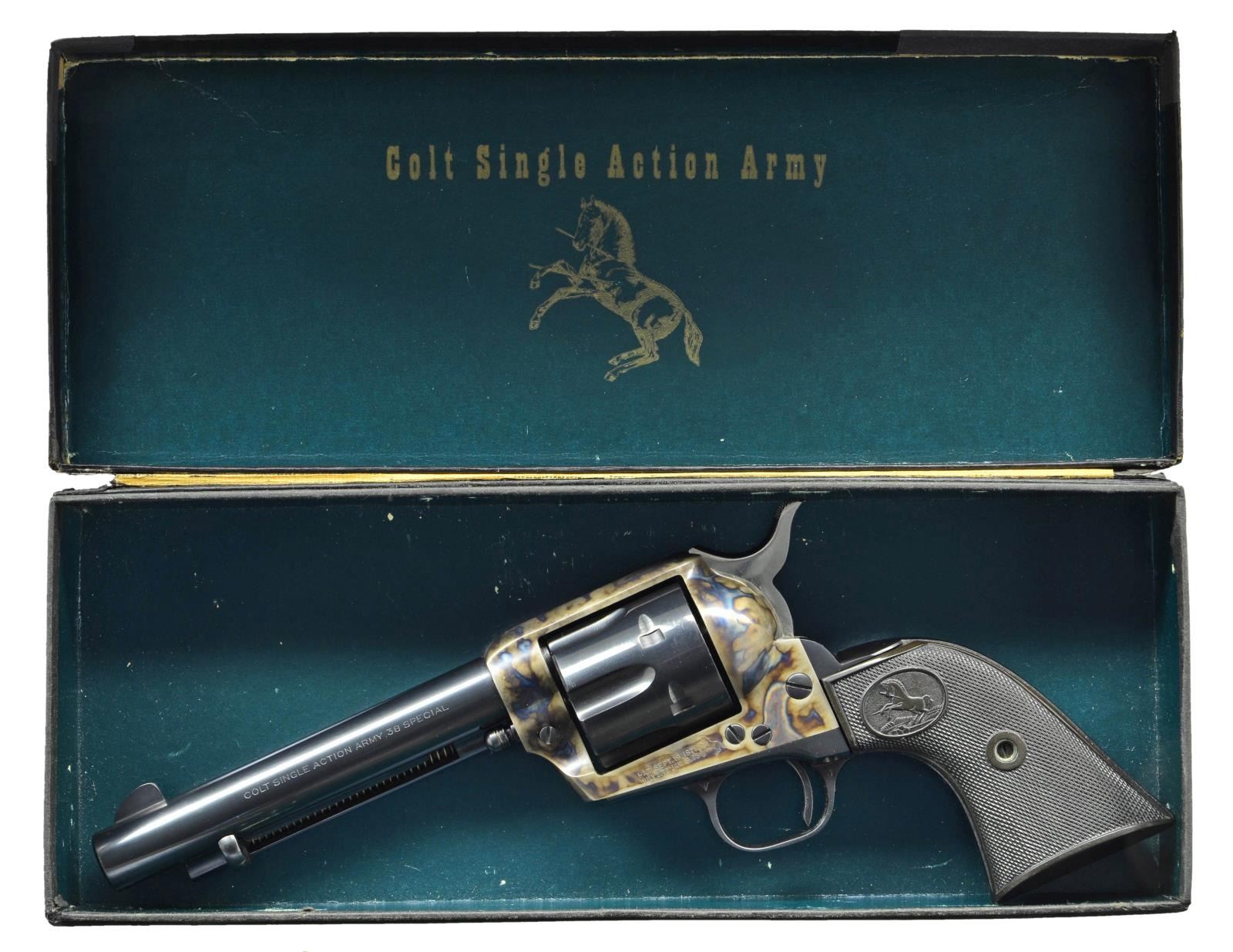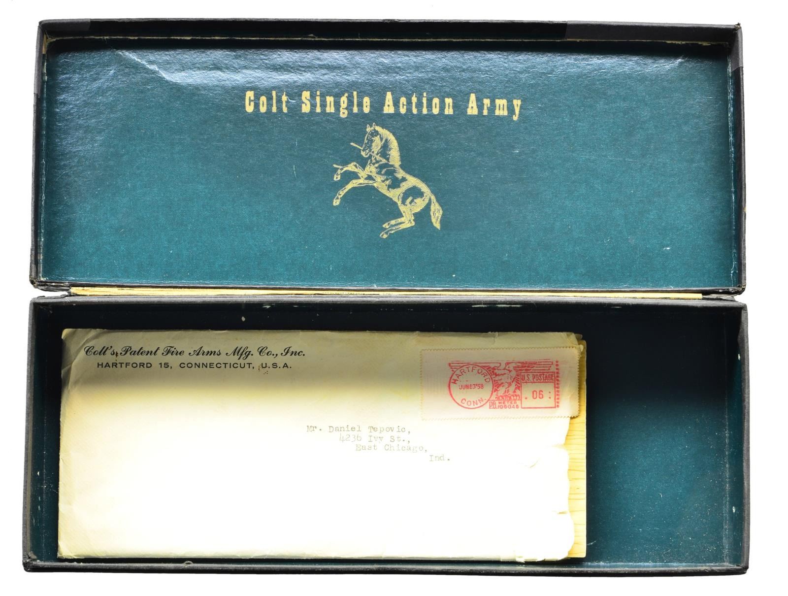 LETTER & BOX. Cal. 38 Spl. S# 12773SA. Bbl. 5 1/2". Blued Barrel, 6 shot fluted cyl. & grip frame. Hard rubber 2 piece Colt grips. Page 38 of "The Post War Colt Single Action Revolver 1955-1975" by Don Wilkerson shows 6,506 SAA revolvers were manufactured in this configuration. UNATTACHED ACCESSORIES: Colt factory letter stating "Serial Number: 12773SA/ Caliber: 38 Special/ Barrel Length: 5 1/2"/ Finish: Blue/ Type of Stocks: Not Listed/ Shipped To: Talhimers- Dept. 570/ Address: 2000 Westmoreland Ave. Richmond, Virginia/ Date of Shipment: August 14, 1957/ Number of Same Type Guns in Shipment: 1". Correct unnumbered black hinged factory box with green interior. Envelope containing warranty card and ppwk. CONDITION: overall near excellent appearing unfired & unturned. Bbl. & cyl. retain 99% blue. Frame retains virtually all its vivid original case colors. Front grip strap has small area (approx. 1/8") of flaked finish. Right side of hammer show small area of minor freckling. Near excellent grips & bore. (22-6028/BH). CURIO. $2,250-3,500.