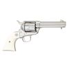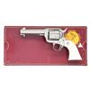 FRONTIER SIX SHOOTER SAA REVOLVER WITH ORIGINAL BOX. Cal 44-40. S# SA67720. Bbl. 4 3/4" with blade front sight. Mfg. 1984. Colt reintroduced this Frontier Six Shooter with angled cyl retaining screw rather than the transverse push button which was introduced in 1896. Another throwback feature is the "bullseye" or "Donut hole" ejector rod head which was discontinued in approx. 1883. Lastly the roll stamp "COLT FRONTIER SIX SHOOTER" appears on left side of bbl, which was also a 1st gen feature. All metal surfaces are nickel plated. 1 Antique ivory grip with Colt medallions. UNATTACHED ACCESSORIES: Matching original maroon Colt box with styrofoam inserts containing original manual & ppwk. 2 piece checkered hard rubber eagle grips. CONDITION: all aspects near excellent; appears new & unfired. (25-1506/BH). MODERN. $1,750-2,500.